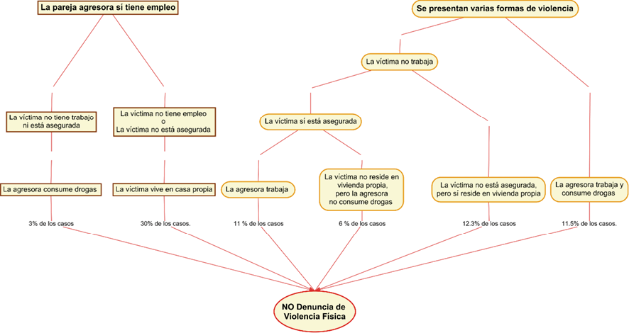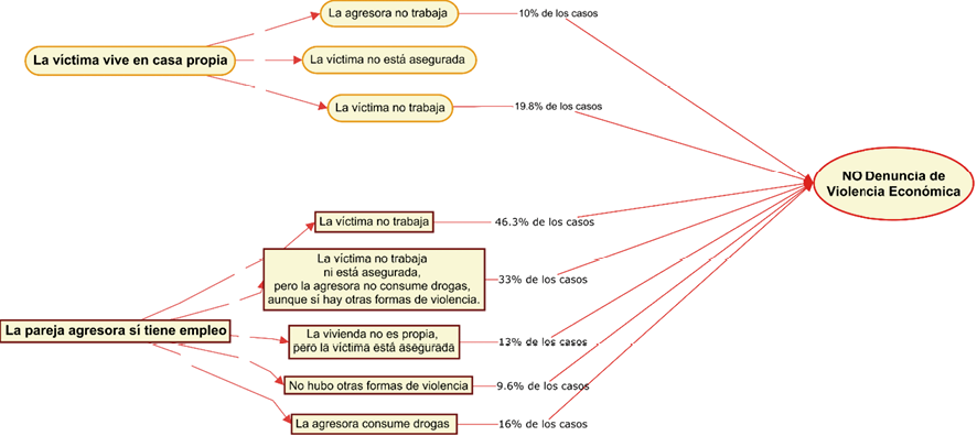 Todos los casos bajo análisis son víctimas de alguna forma de VPI. Como posibles causas de denuncia se considera la disponibilidad de recursos económicos: a) si la víctima reside en vivienda propia; b) si la víctima está afiliada al seguro popular, IMSS o ISSSTE; c) si la víctima trabaja fuera del hogar; además, se consideran rasgos de la persona agresora: si consume drogas, si trabaja fuera del hogar; y si hizo uso de otro tipo de violencia.