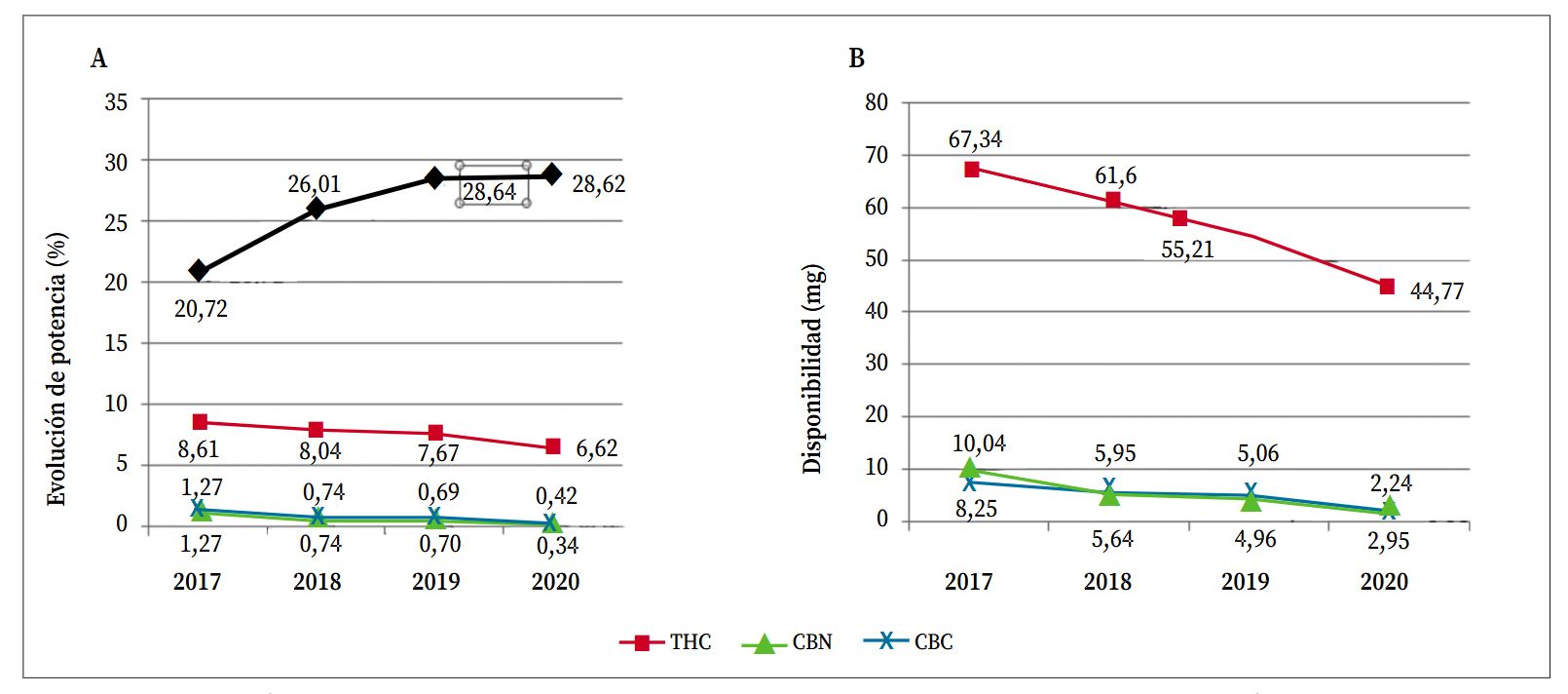 Métodos. Se realizó un estudio descriptivo de porros enteros circulantes incautados por las fuerzas de seguridad en la calle en el periodo 2017 a 2020 en la Comunidad Autónoma de Castilla y León. Se determinó el peso bruto (porro completo) y neto (consumible) y mediante cromatografía de gases se analizó la disponibilidad (mg) de los cannabinoides delta-9-Tetrahidrocannabinol (THC), cannabidiol (CBD) y cannabinol (CBN) para obtener la riqueza/potencia (%) de las muestras y estimar su biodisponibilidad (10% y 25%).