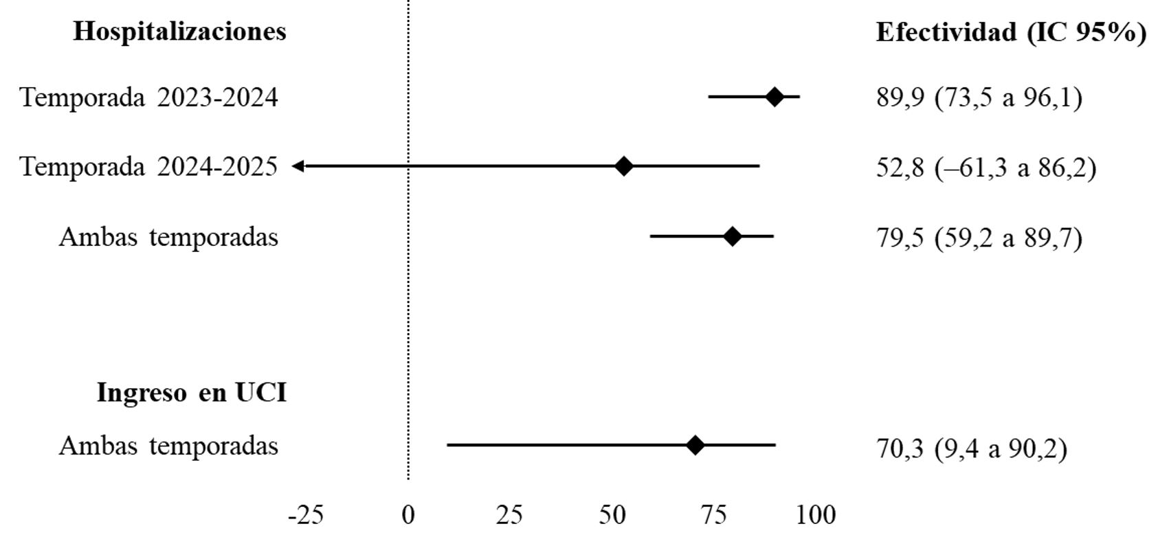 Resultados. Se ofreció nirsevimab a 2.699 recién nacidos, y 2.541 lo recibieron (94,1%). Se registraron 17 hospitalizaciones por VRS en la temporada 2023-2024 y 24 en la 2024-2025. El riesgo promedio de hospitalización por VRS fue 7,6% en no inmunizados y 1,1% en inmunizados. La efectividad promedio del nirsevimab para prevenir hospitalizaciones por VRS fue 79,5% (IC95%: 59,2-89,7), 89,9% en la temporada 2023-2024 y 52,8% en la 2024-2025, sin diferencias significativas entre ambas (p=0,055). La inmunoprofilaxis previno en promedio una hospitalización por VRS por cada 22,6 inmunizados.