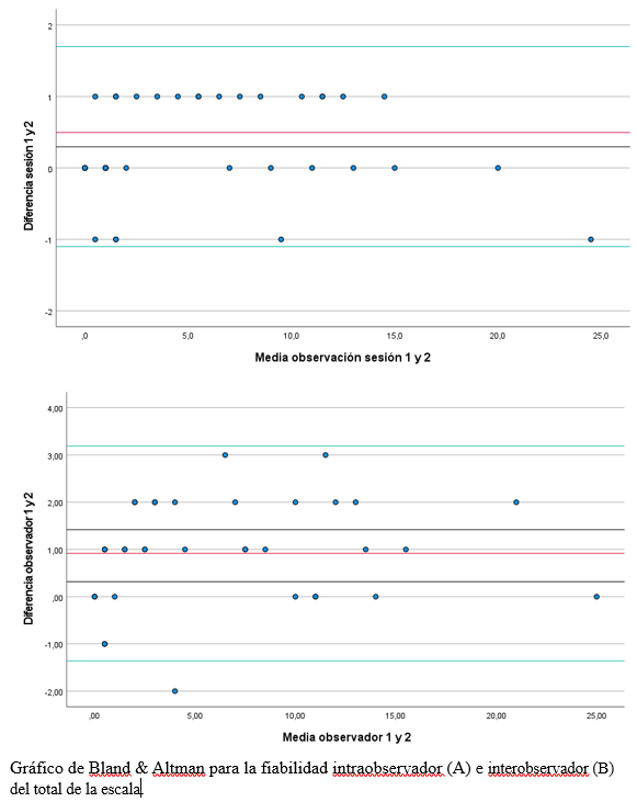 Resultados. Participaron 37 personas, 56,8%, mujeres y edad 45,6 años (DE=13,8). La fiabilidad intraobservador fue excelente (CCI total=0,996; sección 1=0,988; sección 2=0,995), con un CMD95 de 0,12 puntos. La fiabilidad interobservador también fue excelente (CCI total=0,987; sección 1=0,966; sección 2=0,986), con un CMD95 de 0,36 puntos. Los gráficos de Bland-Altman mostraron límites de acuerdo estrechos: ±1,4 puntos (intra) y ±2,28 puntos (inter). La validez de constructo fue alta y significativa (r= -0,773; p<0,001), indicando una fuerte correlación inversa con la escala de Houghton.