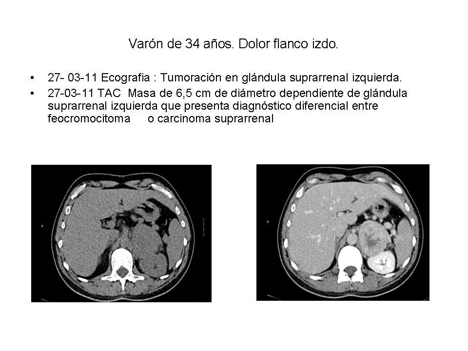 Se presenta el caso de un varón de 34 años de edad, a quien se diagnosticó un feocromocitoma maligno y fue tratado con suprarrenalectomía izquierda lapararoscópica. Se trata de una neoplasia de las células cromafines con una prevalencia de dos casos por millón de habitantes, que, generalmente, causa los síntomas típicos de liberación episódica de catecolaminas. Se describe la forma de presentación del caso, que debuta con episodios sucesivos de dolorimiento abdominal intenso en flanco izdo. En la ecografía abdominopélvica y TAC abdominal, se objetiva una masa de 6,5 cms de diámetro, dependiente de la glándula suprarrenal izda. Se evidencian niveles elevados de metanefrinas y catecolaminas en orina. Se realiza adrenalectomía total izquierda laparoscópica. La anatomía patológica evidencia feocromocitoma maligno.