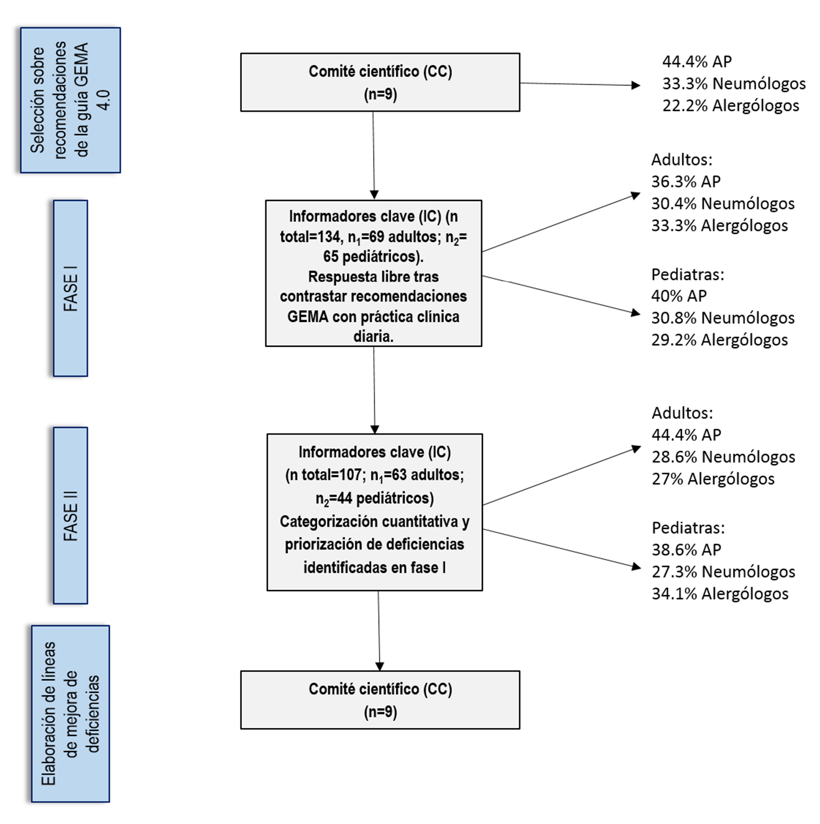 Participaron 134 médicos enla Fase I, y de estos, 107 enla Fase II.El estudio recogió y evaluó las opiniones de un grupo multidisciplinar de expertos en asma (neumólogos, alergólogos, pediatras y médicos de atención primaria).