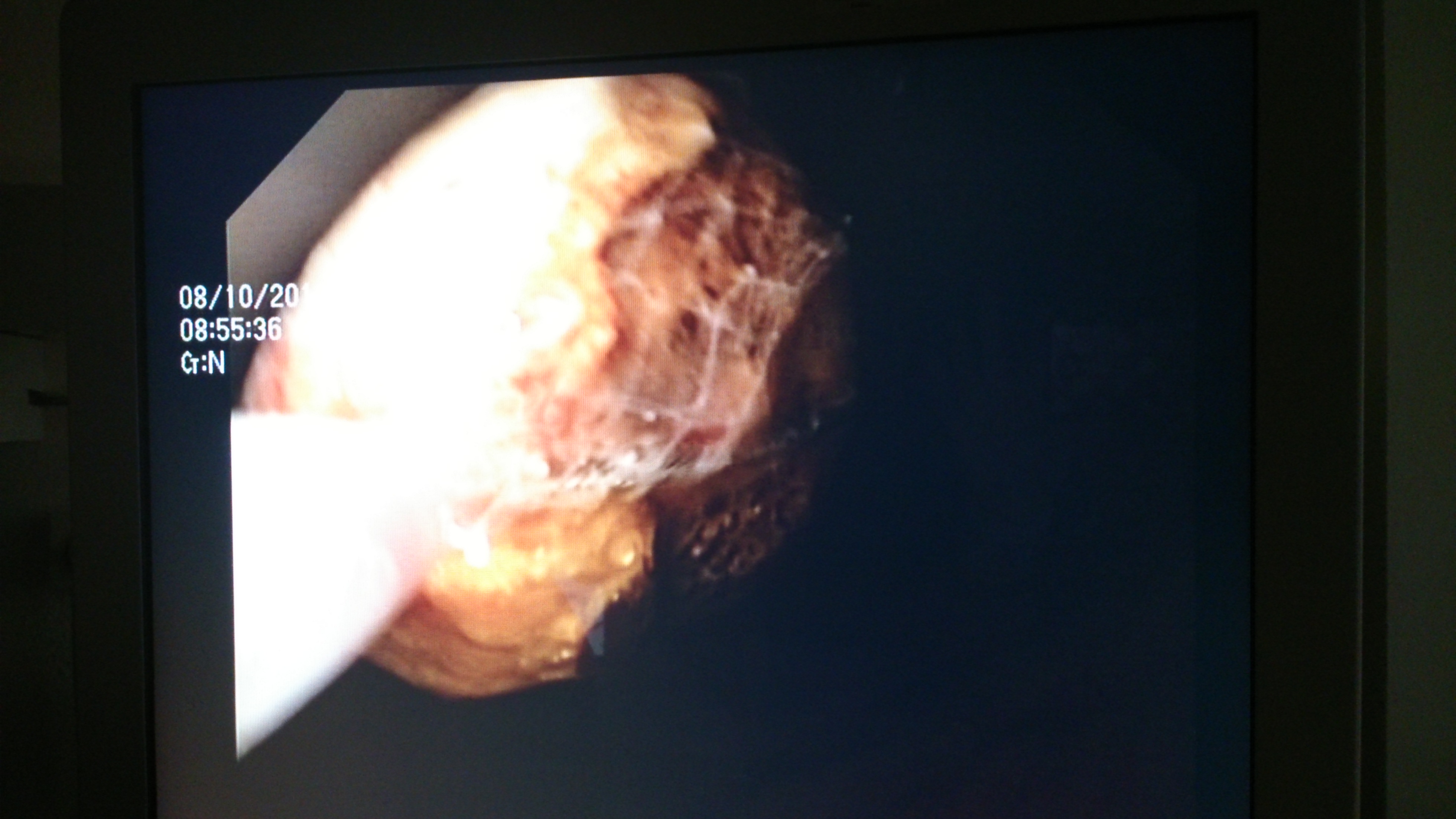 Presentamos el caso de una mujer de 94 años con síndrome de Bouveret, cuyo manejo diagnóstico y terapéutico fue a través de abordaje endoscópico. El síndrome de Bouveret es la imposibilidad de vaciamiento gástrico como consecuencia de la impactación de un cálculo biliar a nivel duodenal, siendo la forma de presentación menos frecuente del íleo biliar. El íleo biliar es una complicación de la colelitiasis, que presenta elevada morbimortalidad por lo que precisa de diagnóstico precoz y tratamiento urgente, que habitualmente es quirúrgico. La peculiaridad de este caso es que se consiguió la resolución completa del cuadro mediante tratamiento endoscópico en una paciente de edad avanzada con elevado riesgo quirúrgico.