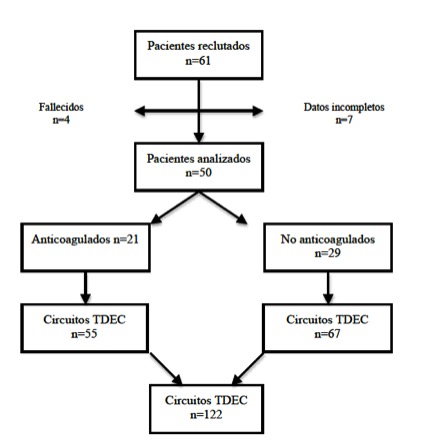 Material y métodos. Se trata de un estudio observacional prospectivo realizado en la Unidad de Cuidados Intensivos (UCI) desde octubre de 2013 hasta abril de 2016. Se incluyeron 61 pacientes que presentaron insuficiencia renal aguda (IRA) con requerimientos de TDEC y un total de 122 circuitos. Tanto los pacientes como los circuitos fueron divididos para su análisis en dos grupos: anticoagulados (AC) y no anticoagulados (No AC). La variable principal fue la supervivencia de los circuitos. Además se recogieron diferentes parámetros analíticos al comienzo del tratamiento y en el momento de coagulación del circuito.
