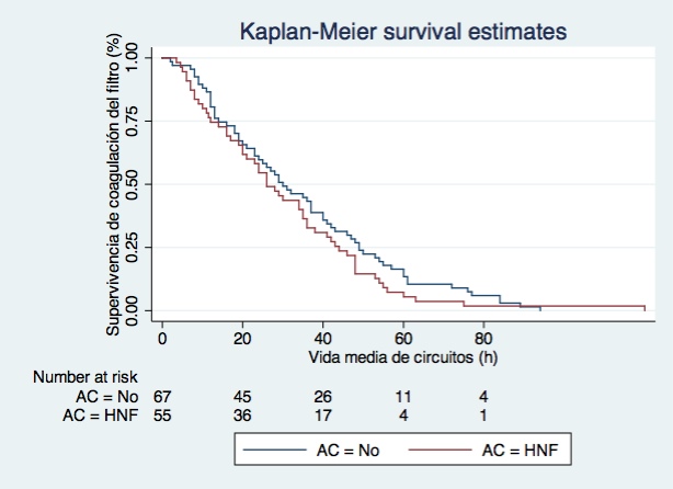 Resultados. La distribución de pacientes anticoagulados y no anticoagulados fue similar. No se han encontrado diferencias significativas en la supervivencia de los circuitos entre ambos grupos (30,5 horas AC vs 34,9 horas No AC). Los pacientes con mayor morbilidad (trombopenia severa, coagulopatía, etc.) pertenecían al grupo que no recibió anticoagulación, sino lavados con suero fisiológico.