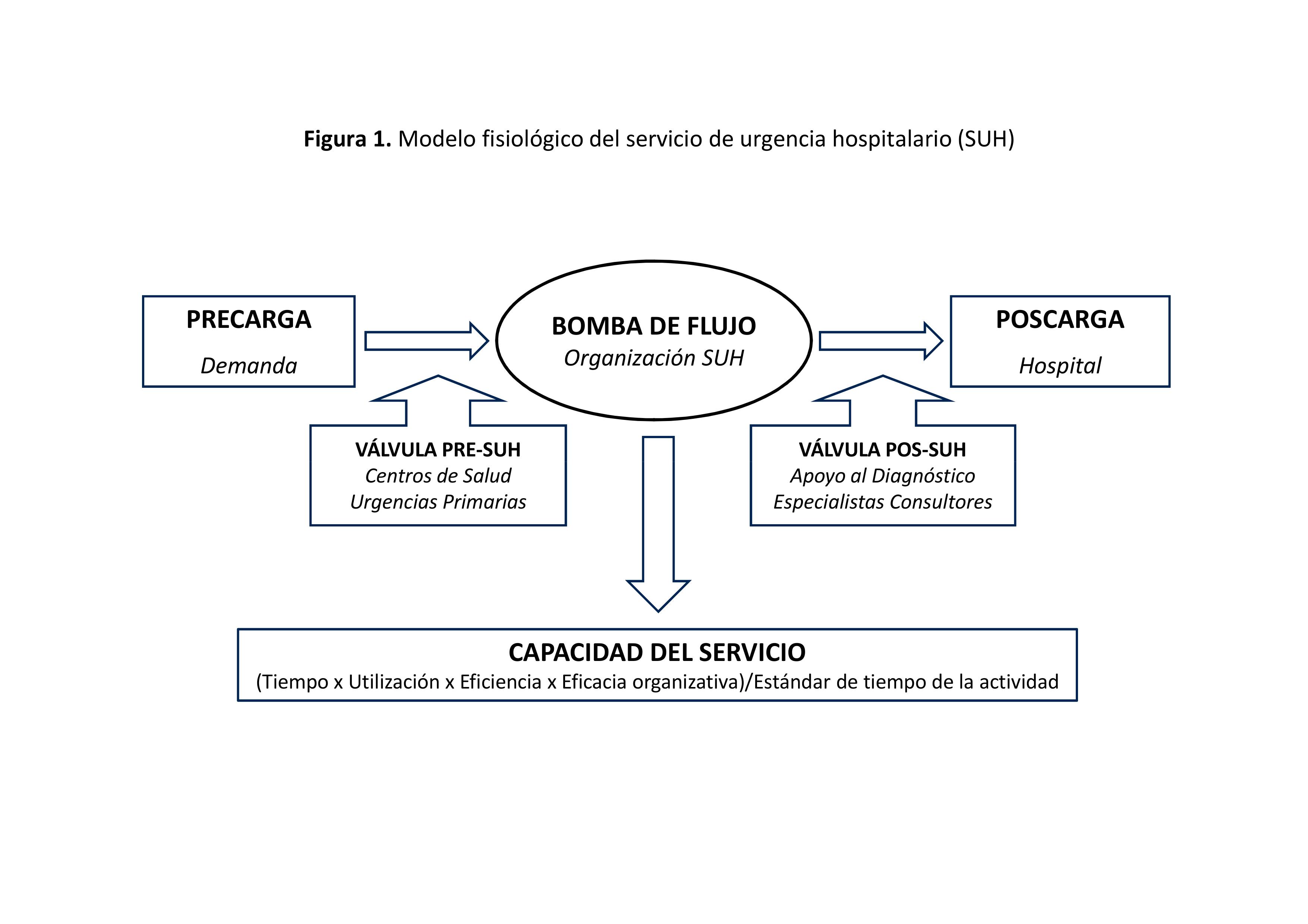 El funcionamiento de los servicios de urgencias hospitalarios (SUH) está determinado por la demanda, la estructura organizativa propia y la conexión con los otros niveles asistenciales. La asincronía entre estos elementos dificulta el flujo de pacientes y merma la capacidad, siendo necesario emplear un enfoque sistémico de la cadena asistencial urgente como una entidad funcional única. Con esta orientación presentamos un modelo teórico conceptual, similar al fisiológico del gasto cardíaco, en el que la precarga es la demanda, la bomba contráctil o de flujo la organización interna propia, la poscarga el hospital, la válvula pre-SUH la asistencia primaria y las urgencias extrahospitalarias, y la válvula pos-SUH los servicios de apoyo al diagnóstico y los especialistas consultores. A partir de dicha concepción se clasifican los distintos tipos de saturación del SUH, se sistematizan sus causas y las diferentes colas de espera que generan, lo cual puede ayudar al rediseño del servicio y a prevenir su saturación y colapso.