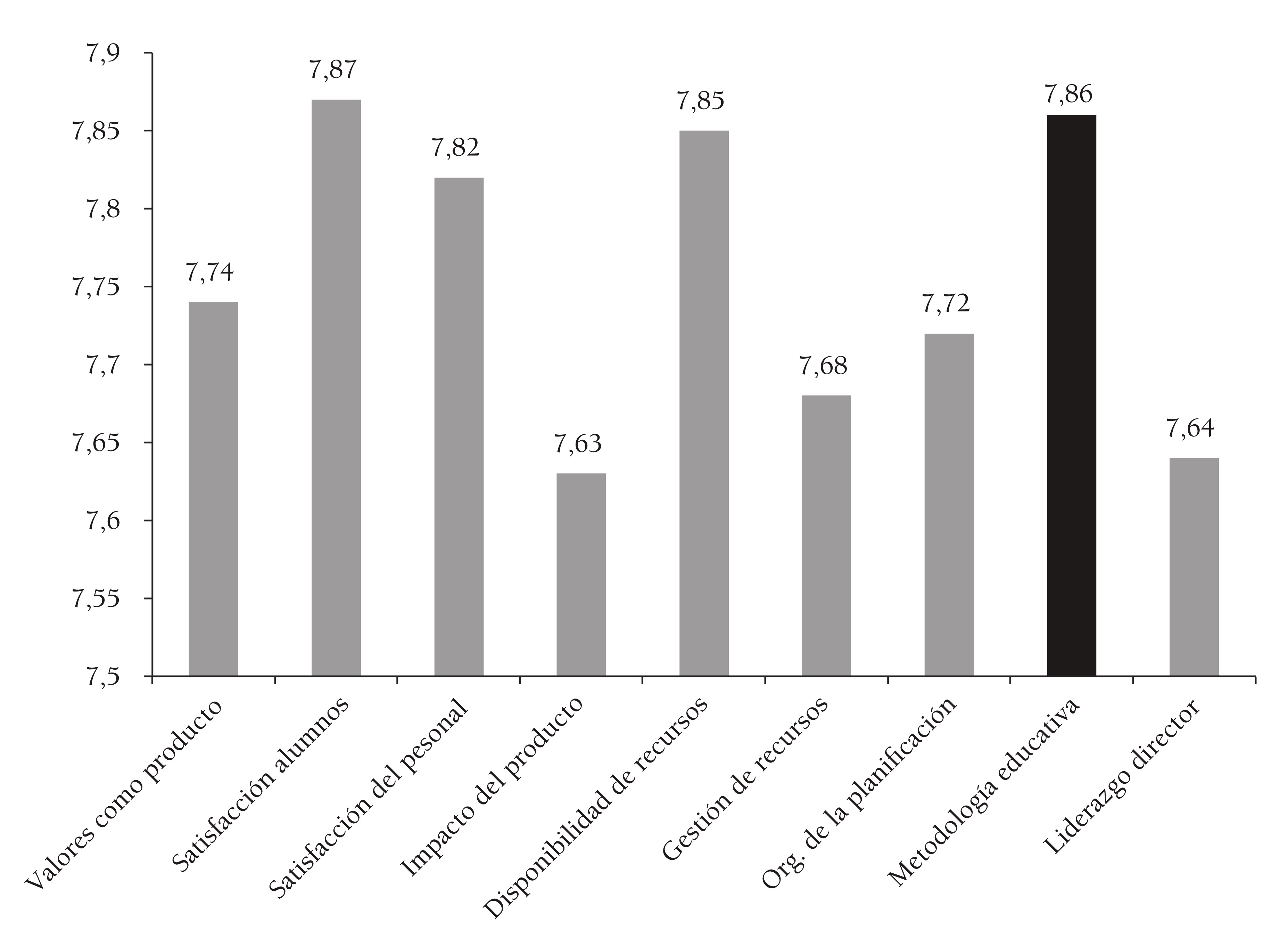 La metodología, como componente fundamental de la calidad de una institución educativa, ocupa un lugar destacado, en consonancia con lo ya apuntado por Graffe (2002Graffe, G. J. (2002). Gestión educativa para la transformación de la escuela. Revista de Pedagogía, 23(68), 495-517. Recuperado de http://www.scielo.org.ve/scielo.php?script=sci_arttextypid=S0798-97922002000300007). Este componente básico de calidad, que se sitúa en el segundo lugar por orden de mayor a menor importancia, ha obtenido una valoración media, por el conjunto de todos los sectores, de 7,86 (sobre una máxima de 9). Es más, la puntuación media obtenida sobre la importancia de la metodología educativa es tan solo superada por uno de los identificadores de calidad, a saber: la satisfacción del alunado. Puede verse, por tanto, que, aun cuando el valor promedio de los predictores en su conjunto es ligeramente inferior al de los identificadores de calidad, la metodología educativa, como predictor de calidad, alcanza una ponderación media que la sitúa inmediatamente después del identificador de calidad denominado satisfacción del alumnado.