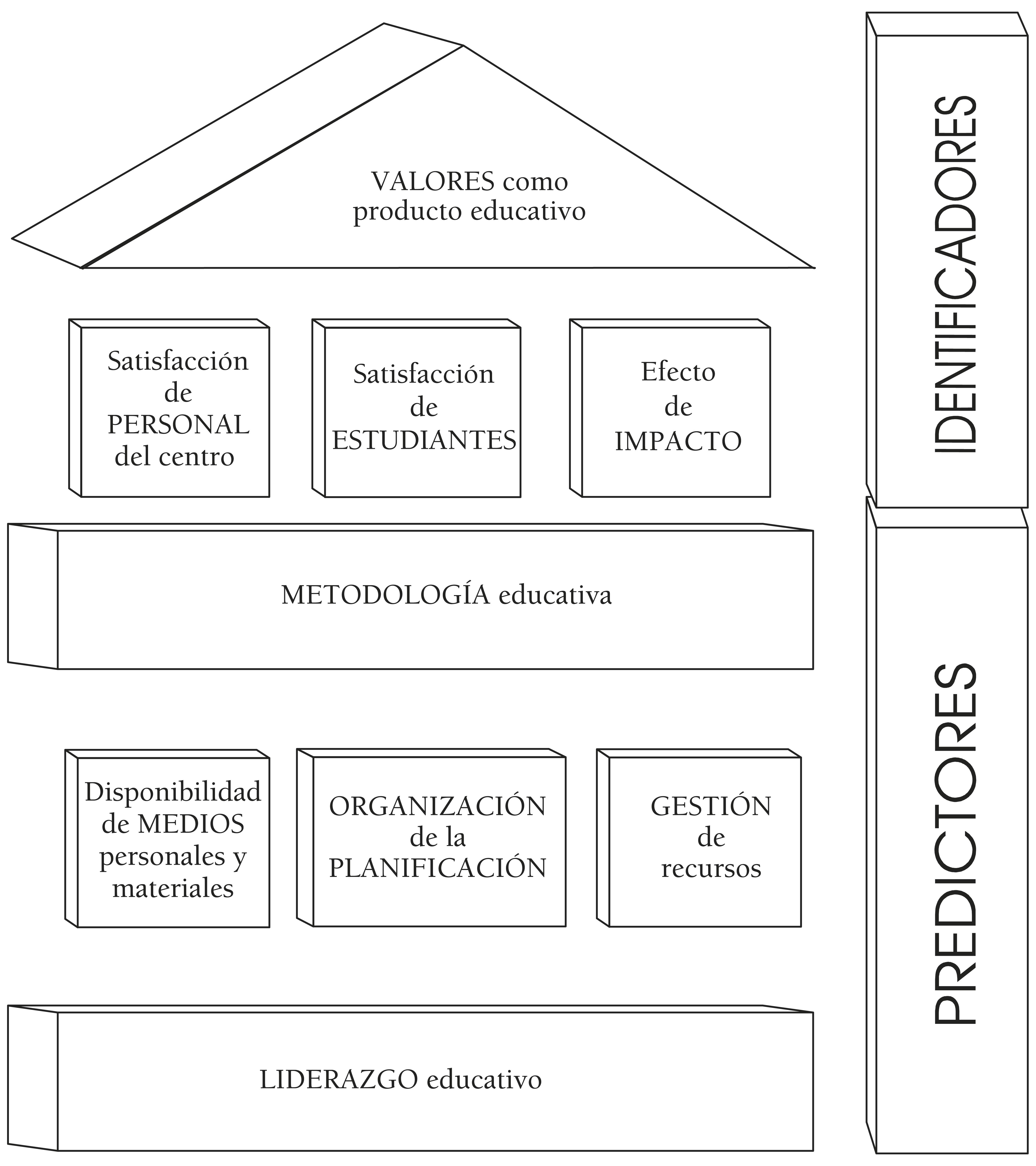 En una línea similar, investigaciones recientes sobre esta temática (García, Gento, Palomares y González, 2012García, M., Gento, S., Palomares, A., y González, R. (2012). Liderazgo educativo y su impacto en las instituciones educativas. En M. Lorenzo y M. López (coords.), Respuestas Emergentes desde la Organización de Instituciones Educativas (pp. 327-370). Granada: Universidad de Granada.; Gento, Hüber, González, Palomares y Orden, 2015Gento, S., Günter, H., González, R., Palomares, A., y Orden, V. J. (2015). Promoting the quality of educational institutions by educational leadership. US-China Education Review B, 5(4), 215-232. doi: 10.17265/2161-6248/2015.04.001) parten de un modelo de referencia que establece que en la calidad de cada institución cabe distinguir componentes que se consideran como “identificadores” y otros a los que se les considera “predictores” (figura 1). Los primeros facilitarían la identificación de la evidencia de calidad; los segundos permitirían predecir la posibilidad de tal calidad. Pero, en realidad, esta distinción es puramente metodológica y se establece para facilitar la comprensión de un sistema global (el de una institución educativa) y su funcionamiento. En la práctica, sin embargo, es difícil separar radicalmente tales componentes. Así, por ejemplo, si bien la metodología es un factor determinante de calidad, no cabe duda de que la forma en que se lleve a cabo produce modos de actuación que pueden ser considerados como resultado, dado que dan pie a una determinada forma de abordar el aprendizaje.