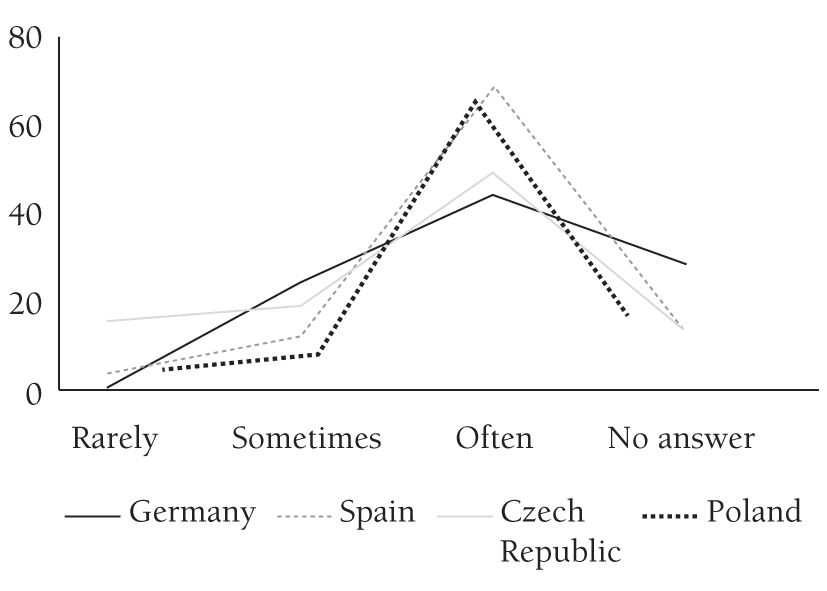 The frequency of the use of the interview has been analysed and the results from the four countries have been compared (table 3, figure 1). According to these results, the Spanish counsellors chose the highest level (“often”) in the greatest number of occasions, and this was also the most common choice amongst the Polish counsellors, however only 50% of the Czech Republic counsellors, and 45.83% of the German counsellors chose this option.