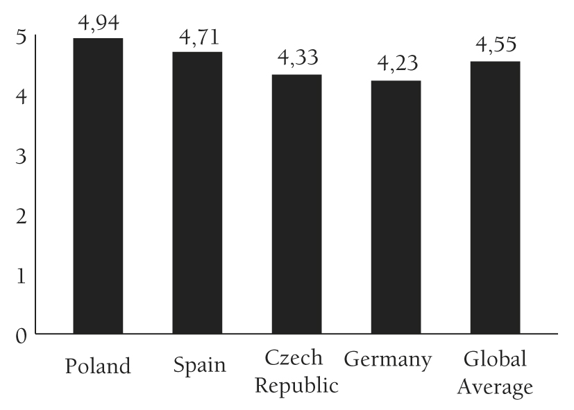 With regards to the level of importance that counsellors place on the interview, in figure 2 the average and global values (4.55/5) can be observed for each European country.
