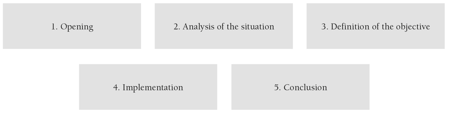 Defining the main objective is the fundamental element of the third phase and the goals must be clearly defined with the party who is being interviewed. The criteria to be considered when formulating shared goals include: their specific nature (particular fields to be improved) and the timeframe for the established targets.