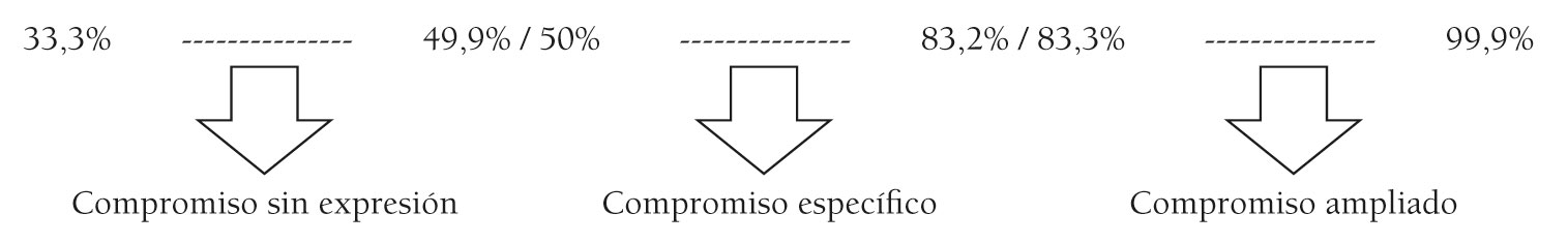 Al sumar las facultades de acuerdo con el resultado del cuestionario obtenido individualmente, se observó la ausencia de las nada comprometidas, un pequeño número con compromiso "ampliado" y una gran parte con compromiso "puntual o específico". Esta concentración dificultó un análisis minucioso de la realidad, lo que llevó a subdividir esta categoría. Por lo tanto, las facultades que obtuvieron entre el 50% y 66,6% fueron consideradas como de "compromiso específico con tendencia a sin expresión"; y las que consiguieron entre el 66,7% y 83,2% se consideraron como de "compromiso específico con tendencia al ampliado". De esta forma, se detectó que la mayoría de las facultades (nueve) se identificaron con un "compromiso específico con tendencia al ampliado" (tabla 2). Este análisis fue validado por el promedio de los resultados de todas las facultades, y también por los resultados presentados en la primera tabla.