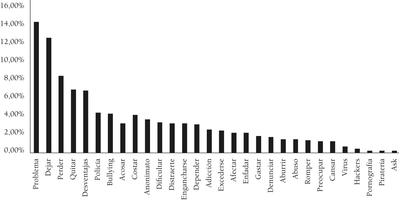 Se advierte que entre los 100 términos más frecuentes en las fuentes primarias, solo 10 tienen connotación negativa, y que el primero de ellos (“problemas") ocupa el puesto 34 de la serie total. La percepción adolescente de las TIC parece fundamentalmente positiva. Lo refuerza que “ventajas" tenga casi doble de incidencias (96) que “desventajas" (59). En cuanto al significado, las primeras palabras indican mengua de posibilidades (“dejar, perder, quitar") reflejando el conflicto entre TIC y actividades en competencia. Aunque “bullying y acoso" (73 referencias), no se relacionan con problemas de los entrevistados, muestran conciencia del deterioro social que supone este mal uso de Internet; el siguiente grupo —“distracción, engancharte, dependencia, adicción y exceso" (en conjunto 126 referencias)— implican la necesidad de controlar el tiempo dedicado a tecnologías, porque hay actividades importantes que se resienten.