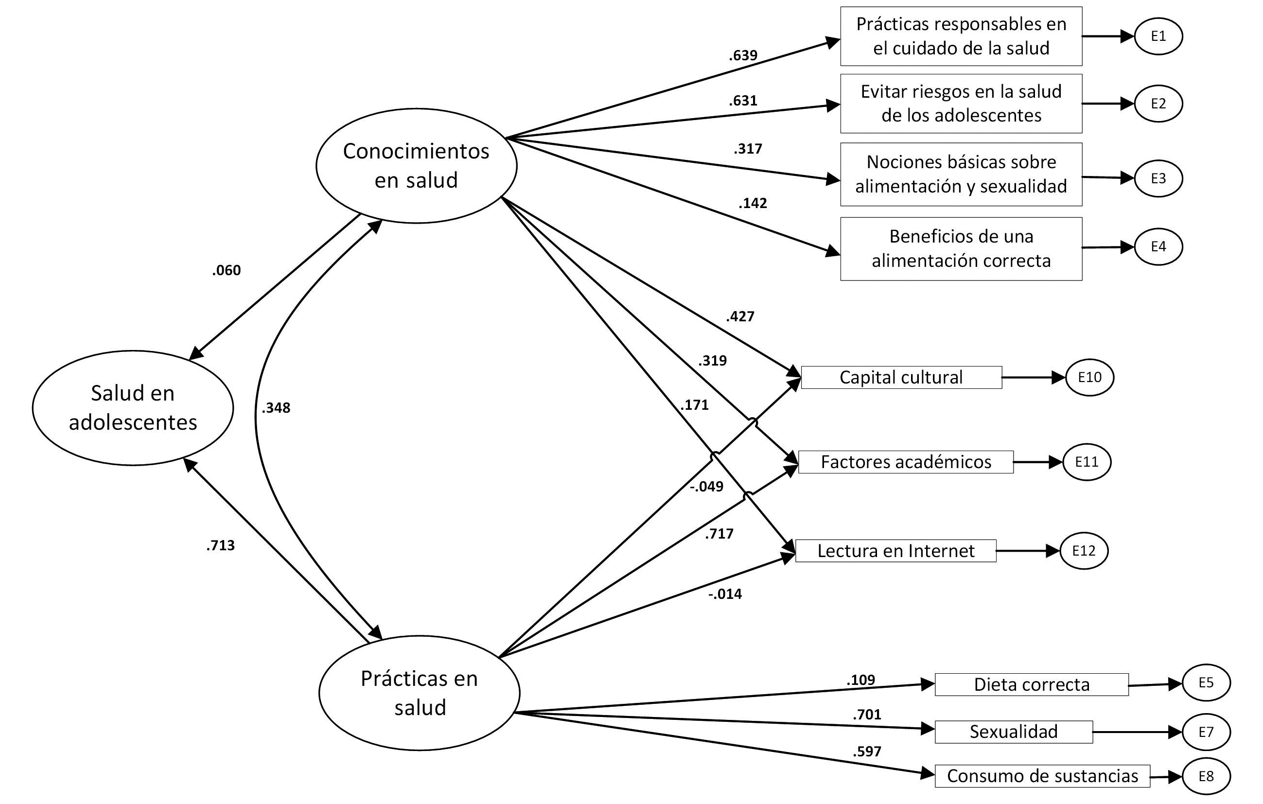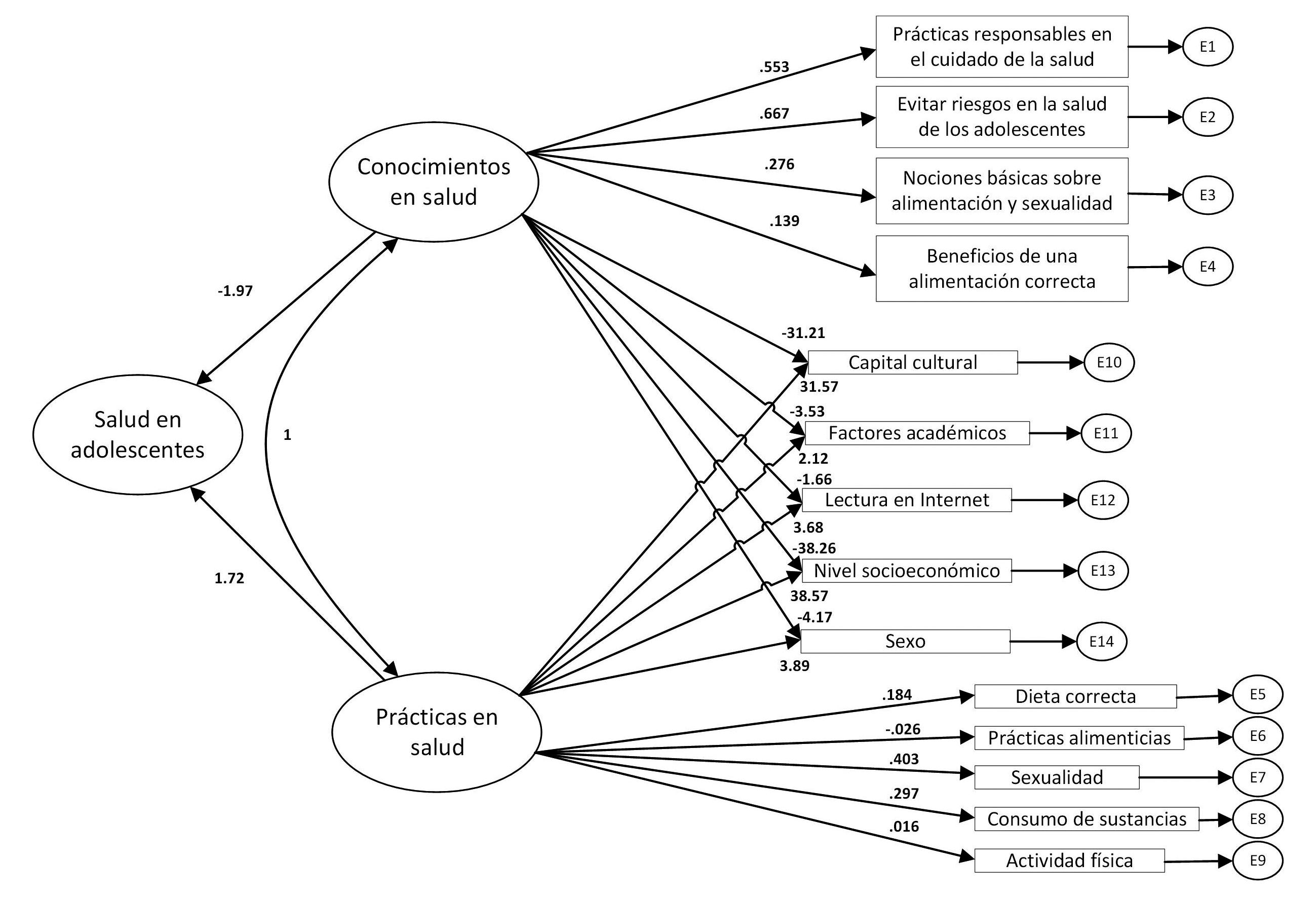 En relación a los coeficientes de las variables, se encontró que los factores académicos influyen en una mayor medida en las prácticas en salud, en comparación a los conocimientos. No obstante, la sexualidad presentó una mayor influencia en las prácticas en salud. Las variables observadas prácticas responsables en el cuidado de la salud y evitar riesgos en la salud de los adolescentes se asociaron en mayor medida con los conocimientos en salud.