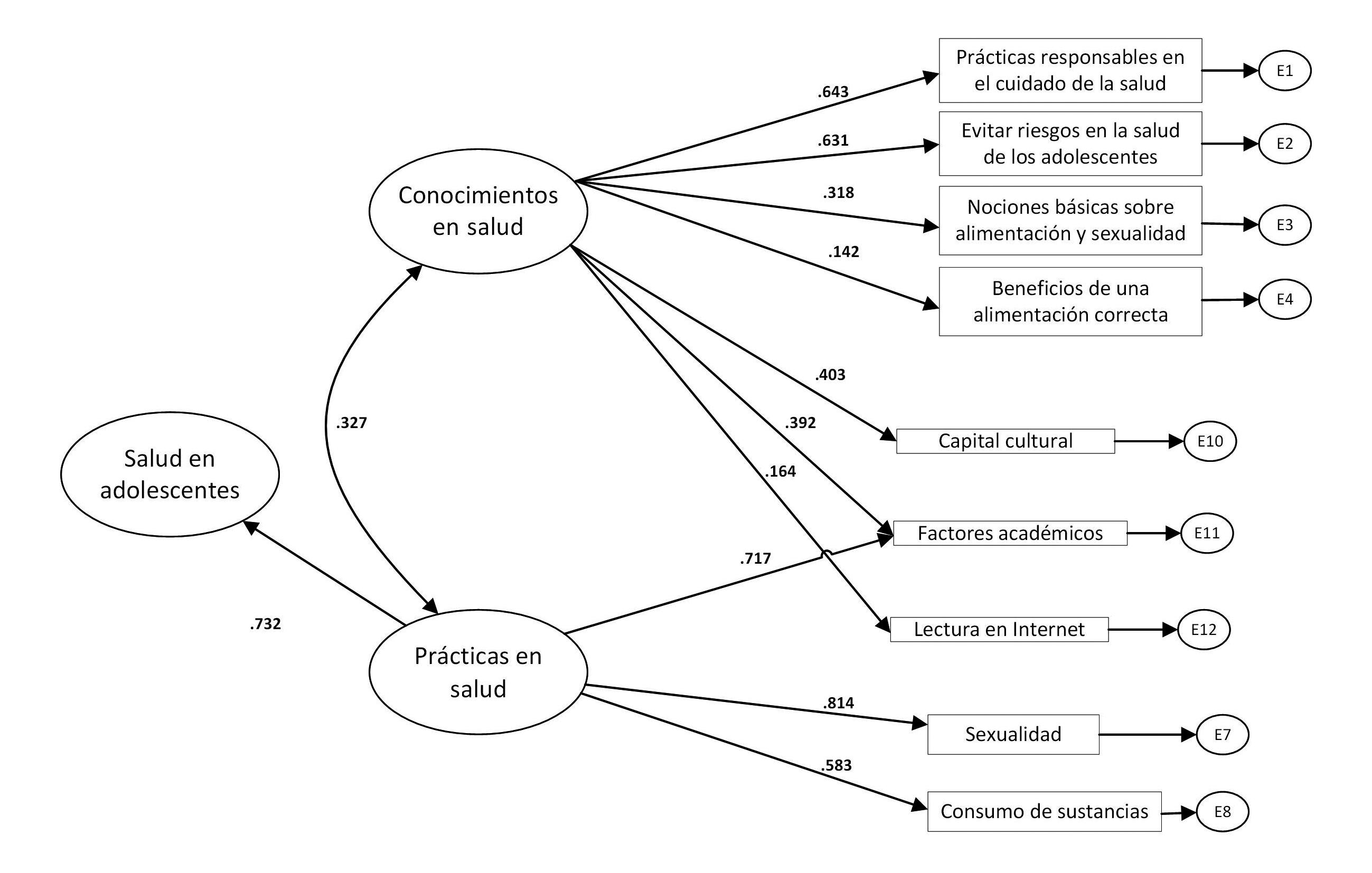 Al calcular el nuevo modelo con los cambios incorporados se obtuvo el modelo 1 que se presenta en la figura 2, el cual cumplió con los estadísticos de bondad de ajuste (tabla 10). En el modelo 1 existen algunos coeficientes de regresión de los factores de mayor influencia que otros. Para el caso de las variables latentes, prácticas en salud (.713) tiene un mayor peso sobre la salud en adolescentes en comparación a los conocimientos de salud. En relación a los conocimientos en salud, recibe una mayor influencia de prácticas responsables en el cuidado de la salud (.639), evitar riesgos en la salud de los adolescentes (.631) y capital cultural (.427). Por su parte, sexualidad (.701), consumo de sustancias (.597) y factores académicos (.717) presentan un mayor peso hacia prácticas en salud.