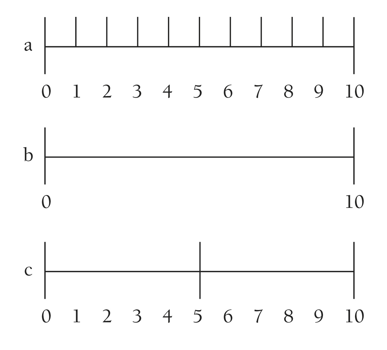 Figure 1. Examples of a number line with unit divisions (a), a number line typically used in research (b), and a number line with a midpoint reference as used in the present research (c)
