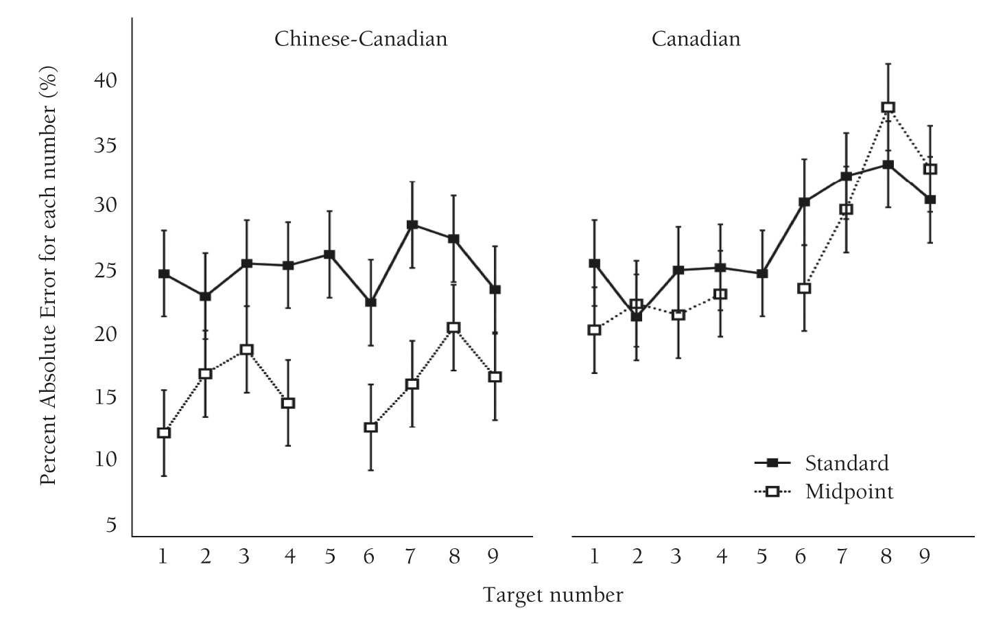 The main effect of target number was significant. Children were most accurate on number 1 (MPAE= 21%) and least accurate on number 8 (MPAE= 30%). The three-way interaction among group, condition, and target number was not statistically significant. As shown in figure 2, the Chinese-Canadian children showed less error on all of the numbers in the midpoint condition compared to the standard condition whereas the other Canadian children’s performance was very similar across conditions for all numbers. Figure 2 does provide some suggestion of why the Chinese-Canadian children performed better in the midpoint condition. They had less error near the endpoints and the midpoint, specifically less error at 1 and 6 than at 3 and 8 in the midpoint condition. This pattern is consistent with the possibility that these children were using the midpoint to refine their estimates.