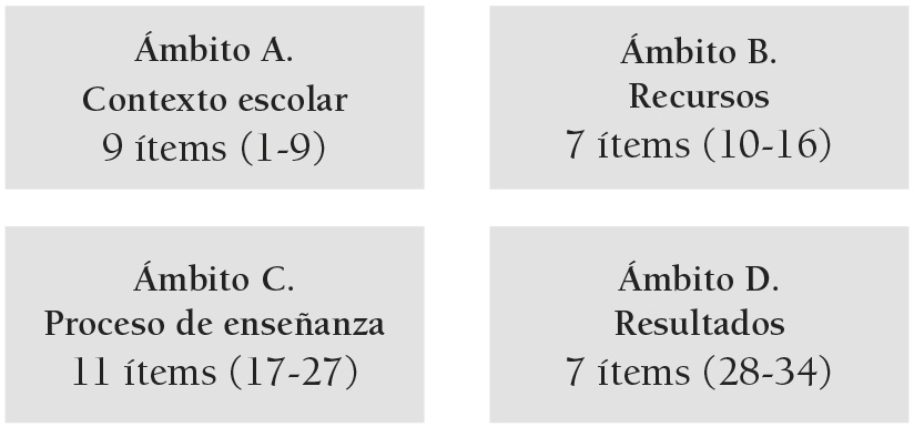 Tras una revisión de la literatura orientada a conocer con más fundamento los distintos instrumentos de evaluación de la calidad educativa y, más concretamente, los instrumentos que permitieran la evaluación de medidas de atención a la diversidad desde la inclusión, se decidió utilizar el cuestionario “Autoevaluación de Centros para la Atención a la Diversidad desde la Inclusión” (ACADI) (Arnaiz y Guirao, 2015Arnaiz, P. y Guirao, J. M. (2015). La autoevaluación de centros en España para la atención a la diversidad desde una perspectiva inclusiva: ACADI. Revista Electrónica Interuniversitaria de Formación del Profesorado, 18(1), 45-101. ) formado por cuatro ámbitos, 63 indicadores organizados en categorías y un total de 576 ítems. Para este estudio se han destacado las puntuaciones a 34 de los ítems más representativos del instrumento, incluyendo de forma balanceada ítems de los cuatro ámbitos del instrumento: contexto escolar, recursos, proceso educativo y resultados (véase figura 1). Para la valoración de los ítems se utilizó una escala tipo Likert de cuatro niveles (1 nada, 2 poco, 3 bastante, 4 mucho). El instrumento fue de la misma forma sometido a un análisis de la consistencia interna, reflejando, mediante el coeficiente Alfa de Cronbach, una consistencia muy buena para el cuestionario completo (α=.930) y por cada uno de los ámbitos que lo componen: contexto escolar (α=.703); recursos (α=.804); proceso de enseñanza (α=.864); y resultados (α=.818).