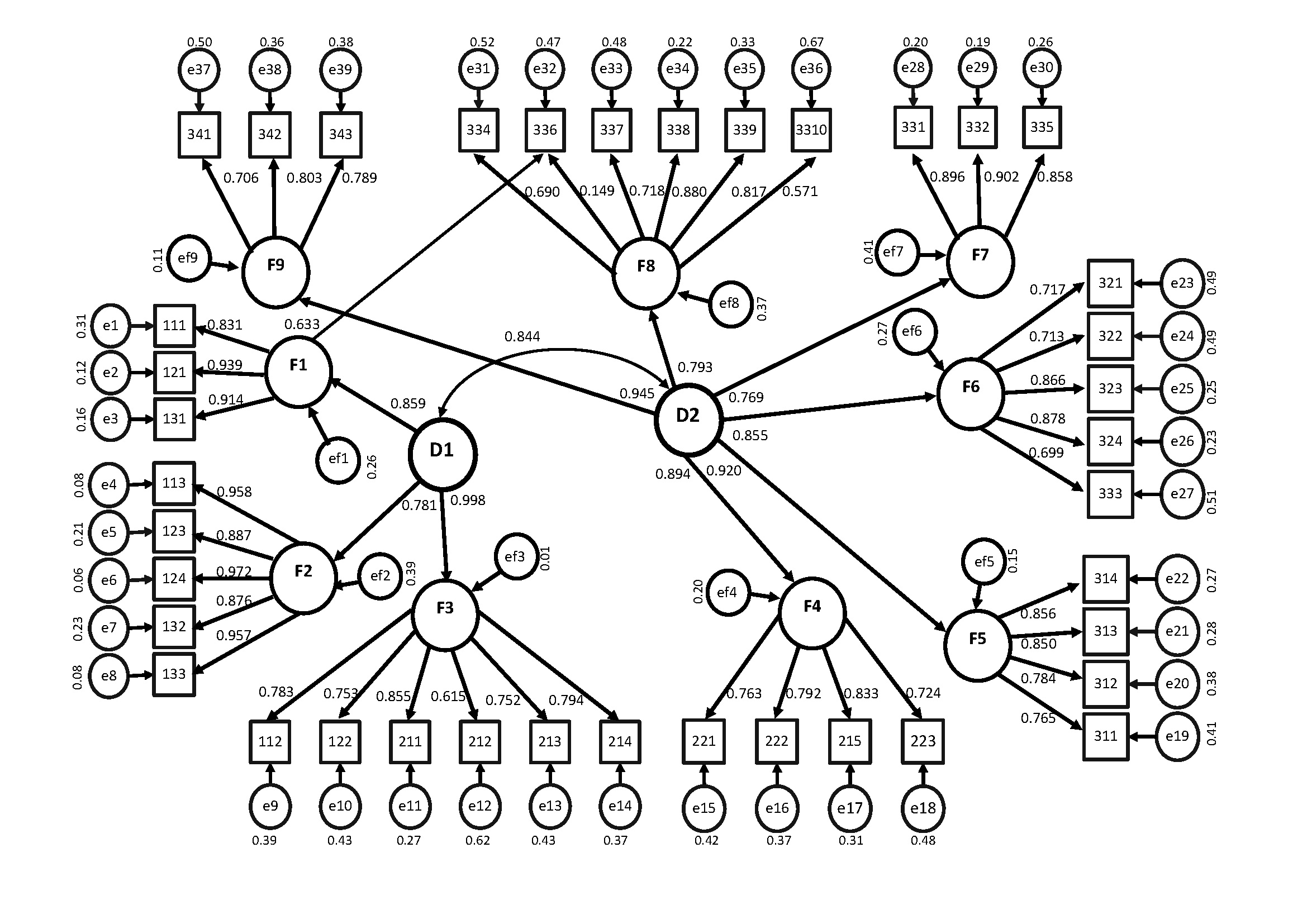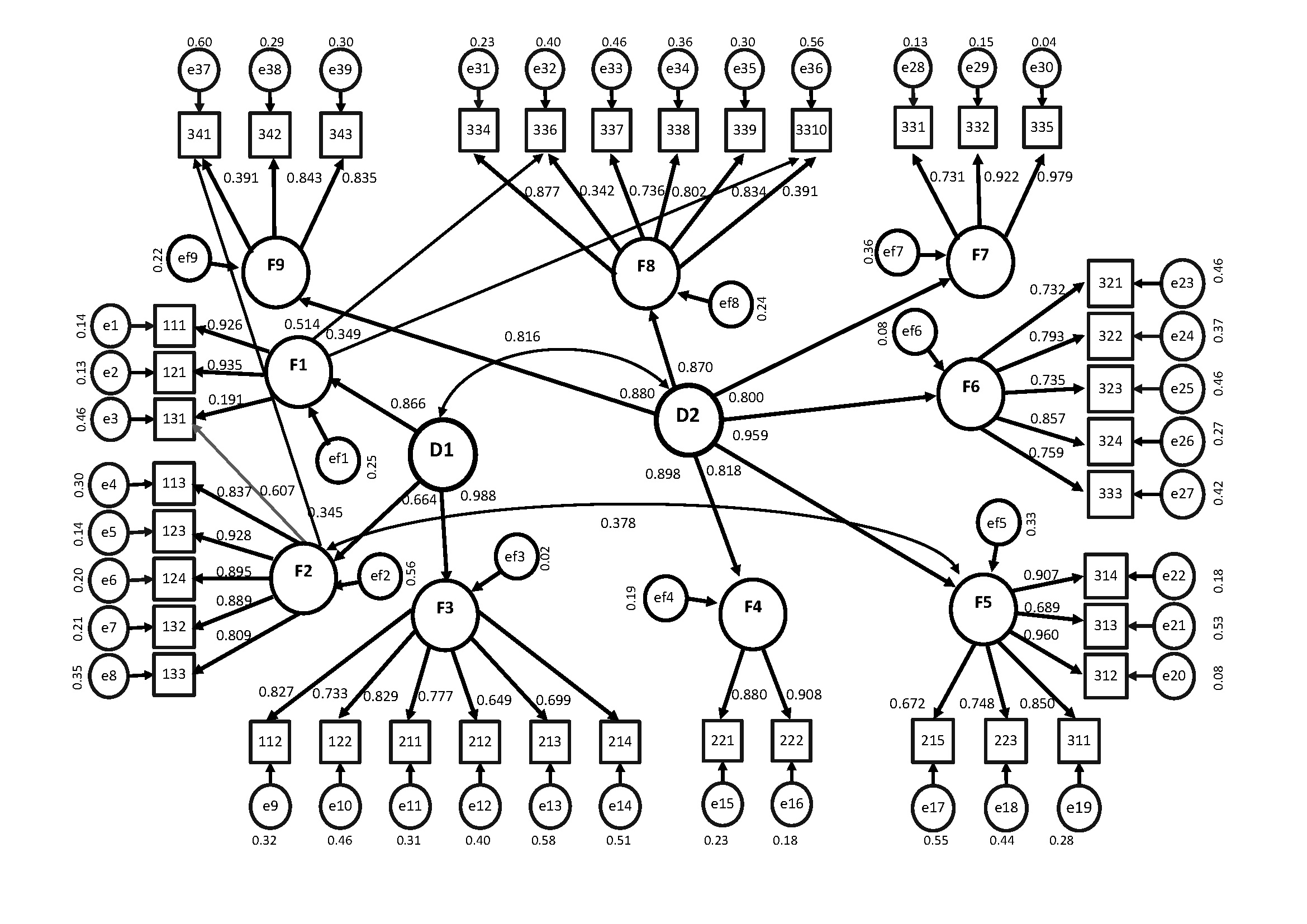 Tanto en el modelo teórico como en el modelo final se distinguen 9 subdimensiones, existiendo algunas diferencias en su configuración interna y en su denominación. En ambas etapas educativas, las tres subdimensiones “Contribuir a la orientación personal del alumnado”, “Contribuir a la orientación académica del alumnado” y “Contribuir a la orientación profesional del alumnado” se reconfiguran en dos: “Conocer al alumnado” (F2) e “Informar, asesorar y derivar a otros profesionales” (F2). Es decir, en lugar de agruparse atendiendo a las áreas generales de intervención de la orientación y la tutoría (personal, académica y profesional), su estructuración se establece conforme a funciones globales que incluyen tareas concretas, pero de carácter transversal a todas las áreas.