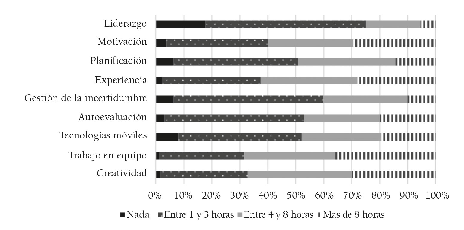 A continuación, podemos ver ahora cuál es la disponibilidad horaria que asignarían para el desarrollo de cada una de estas capacidades. Los docentes son más favorables a dedicar parte de su dedicación docente a capacidades como el trabajo en equipo, la motivación, la creatividad o el aprendizaje a partir de la propia experiencia, que a otras como el liderazgo, el uso de las tecnologías móviles o la planificación de los propios aprendizajes (véase que, en estos tres últimos casos, hay una parte importante de los informantes que no está dispuesto a dedicarles ningún tiempo en sus sesiones; y, en oposición, las capacidades que hemos indicado al inicio son aquellas en las que más porcentaje de profesores se considera dispuesto a dedicarles más de 8 horas de la docencia presencial) (gráfico 3).