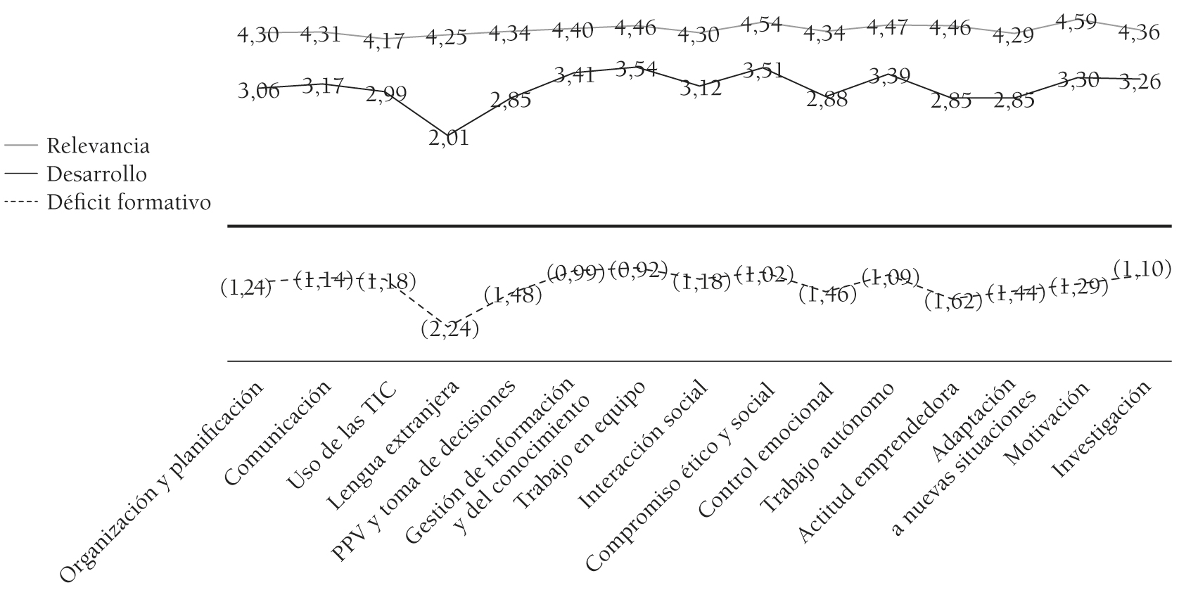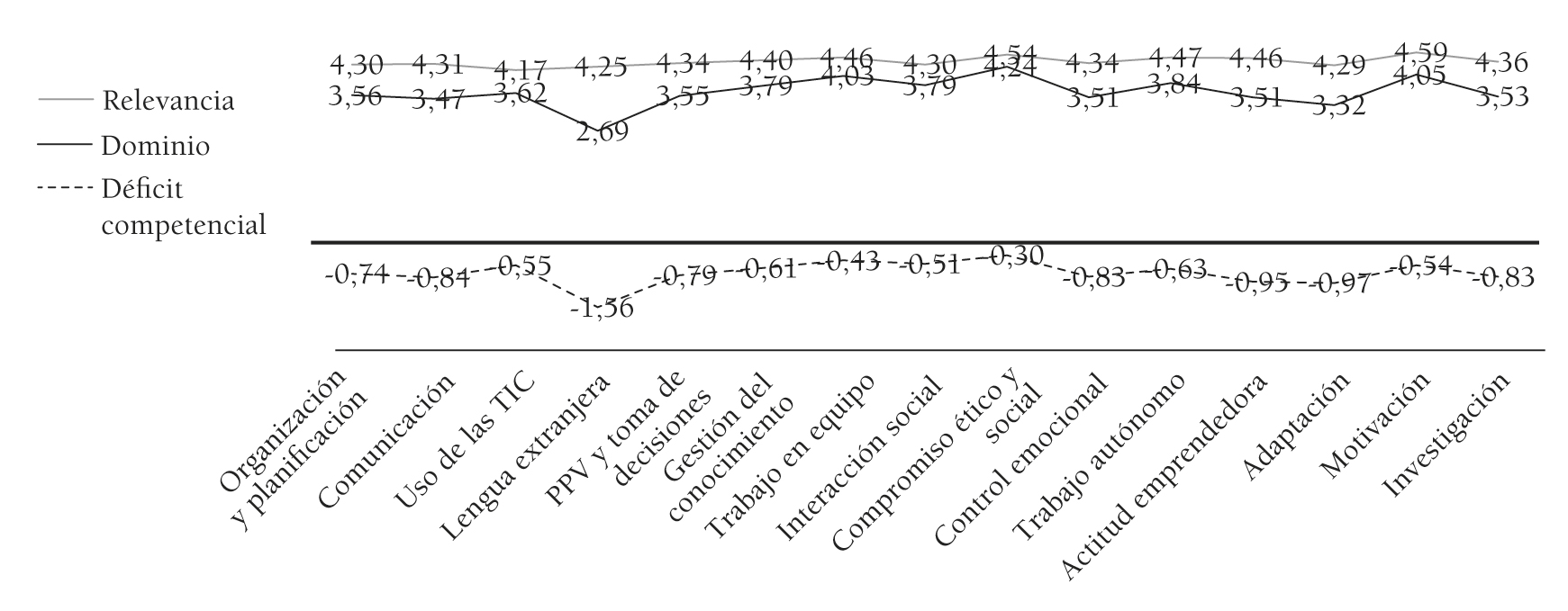 En la figura 6 se representan las discrepancias existentes entre ellas y se aprecia cómo las competencias más desarrolladas coinciden con las más dominadas y estas a su vez con las más relevantes para el estudiante (trabajo en equipo, compromiso ético y social y motivación). Por tanto, estos resultados indican que, a pesar de las diferencias, existe una tendencia positiva hacia el ajuste competencial de la formación universitaria a los requerimientos profesionales percibidos por el futuro egresado.