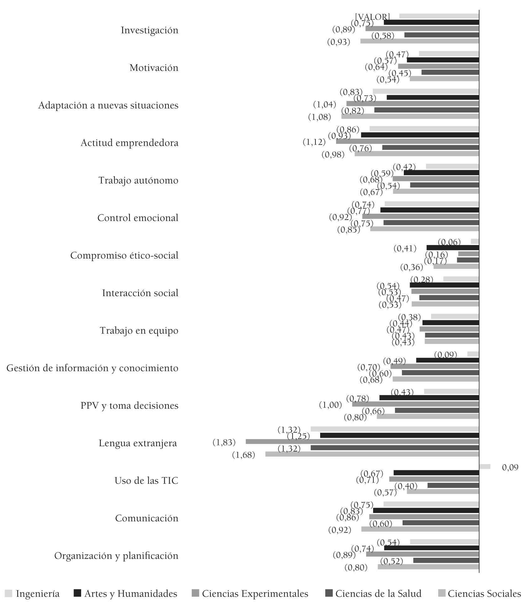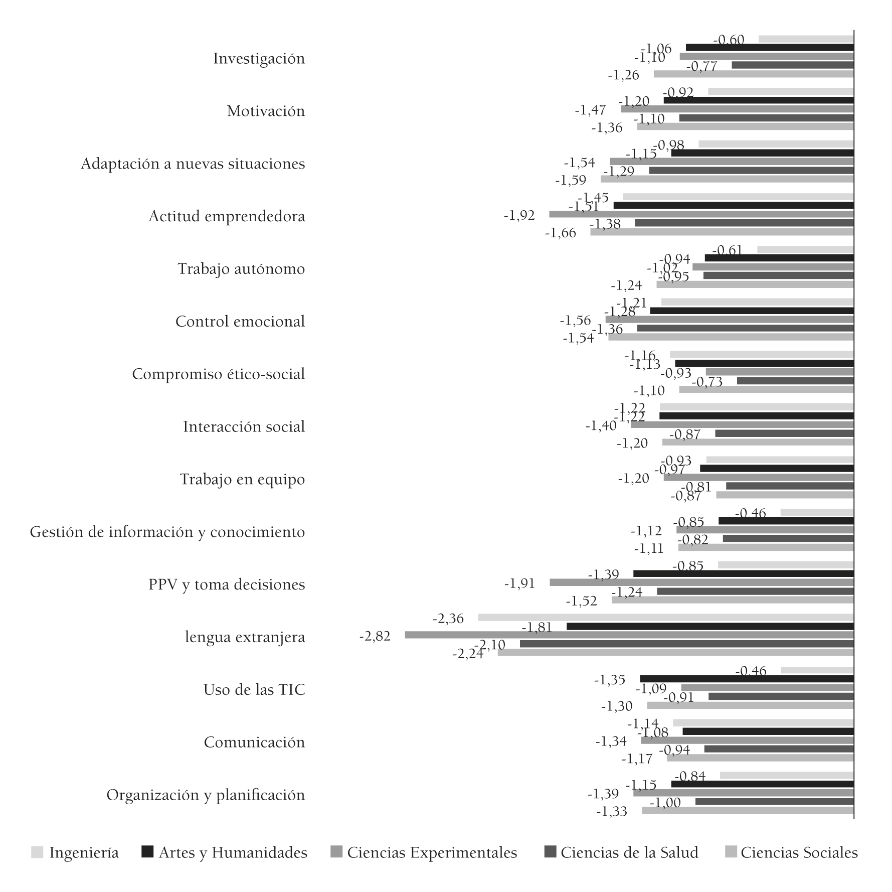 Las competencias que tienen un desajuste más elevado son la lengua extranjera, el control emocional, la actitud emprendedora y la adaptación a nuevas situaciones, con un déficit competencial que oscila entre -1.56 y -.95. Un segundo grupo de competencias coincide con un déficit entre -1 y -0.5 puntos. En este grupo se encuentran la mayoría de las competencias instrumentales y parte de las sistémicas. Por último, las competencias en las que se percibe un índice relativamente bajo, menor a -0.5 puntos, son el trabajo en equipo y el compromiso ético y social.