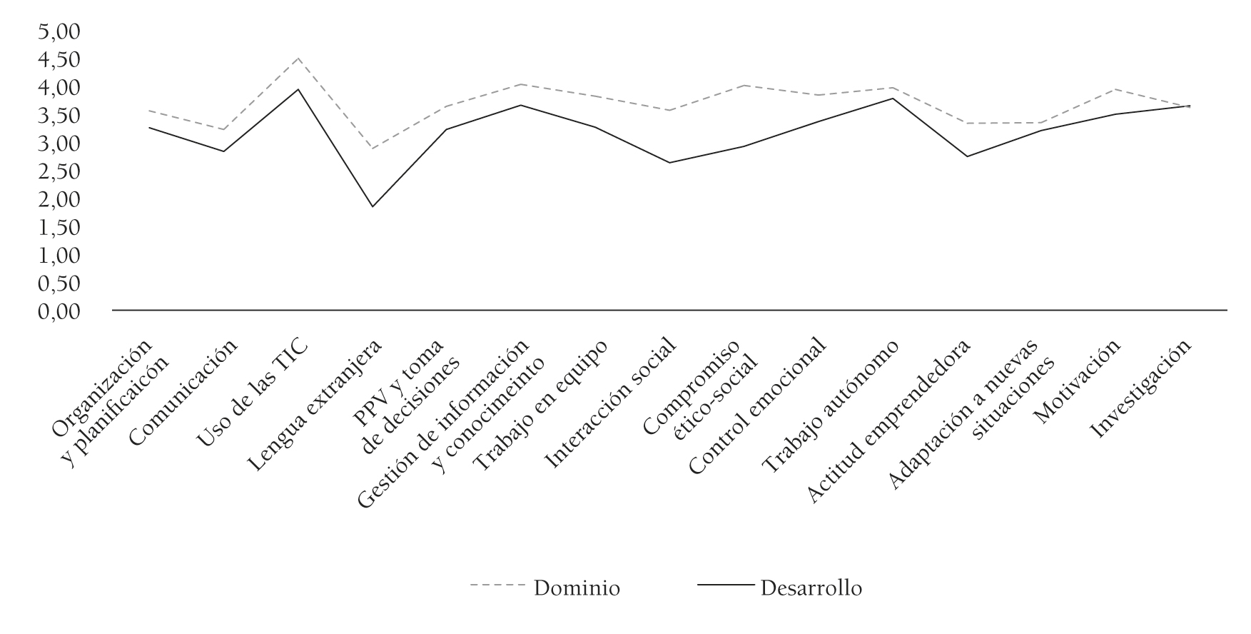 Cabe destacar que las competencias más notorias tanto por exceso como por defecto son coincidentes en ambas variables, y todas ellas siguen una tendencia similar, de forma que las más dominadas son también las más desarrolladas. Por un lado, se concluye con la fuerte repercusión que tiene la formación universitaria en el bagaje competencial del estudiante y su efectividad, a pesar de las distancias encontradas entre desarrollo y dominio en este y otros estudios (ANECA, 2007Agencia Nacional de Evaluación de la Calidad Universitaria y Acreditación (ANECA) (2007). Informe ejecutivo. El profesional flexible en la sociedad del conocimiento. Madrid, España: ANECA; Michavila et al., 2016Michavila, F., Martínez, J. M., Martín-González, M., García-Peñalvo, F. J. y Cruz-Benito, J. (2016). Barómetro de empleabilidad y empleo de los universitarios en España, 2015 (Primer informe de resultados). Madrid, España: Observatorio de Empleabilidad y Empleo Universitarios., 2018Michavila, F., Martínez, J. M., Martín-González, M., García-Peñalvo, F. J., Cruz-Benito, J. y Vázquez-Ingelmo, A. (2018). Barómetro de empleabilidad y empleo universitarios. Edición Máster 2017. Madrid, España: Observatorio de Empleabilidad y Empleo Universitarios.). Por otro lado, se refleja, una vez más, la insuficiencia de las iniciativas, estrategias o sistemas utilizados para su desarrollo en las aulas universitarias en coherencia con la percepción de los propios docentes (Fernández-Ferrer y Forés, 2018Fernández-Ferrer, M. y Forés, A. (2018). Evaluación del desarrollo competencial en la educación superior. La perspectiva del profesorado universitario. Educar, 54(2), 391-410. doi: https://doi.org/10.5565/rev/educar.799).