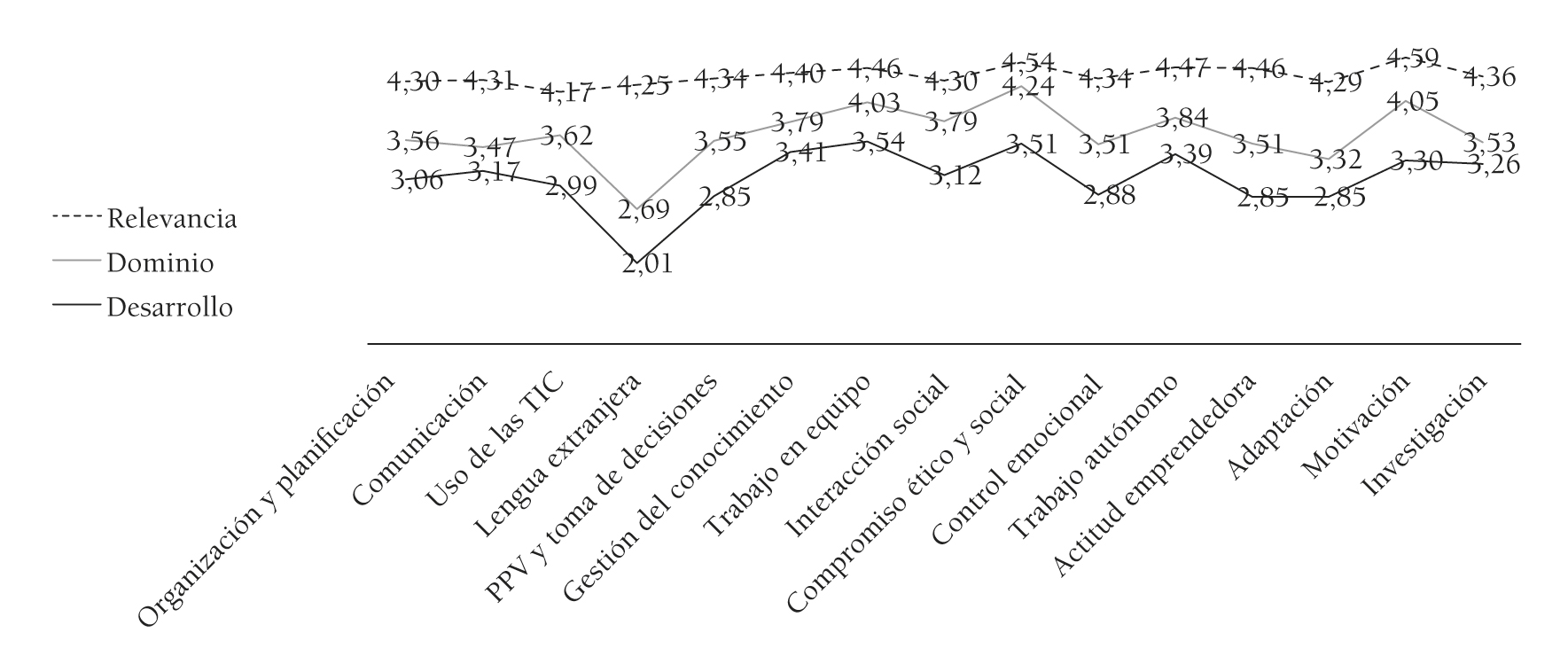 Figura 6. Contraste entre desarrollo, dominio y relevancia de las competencias transversales