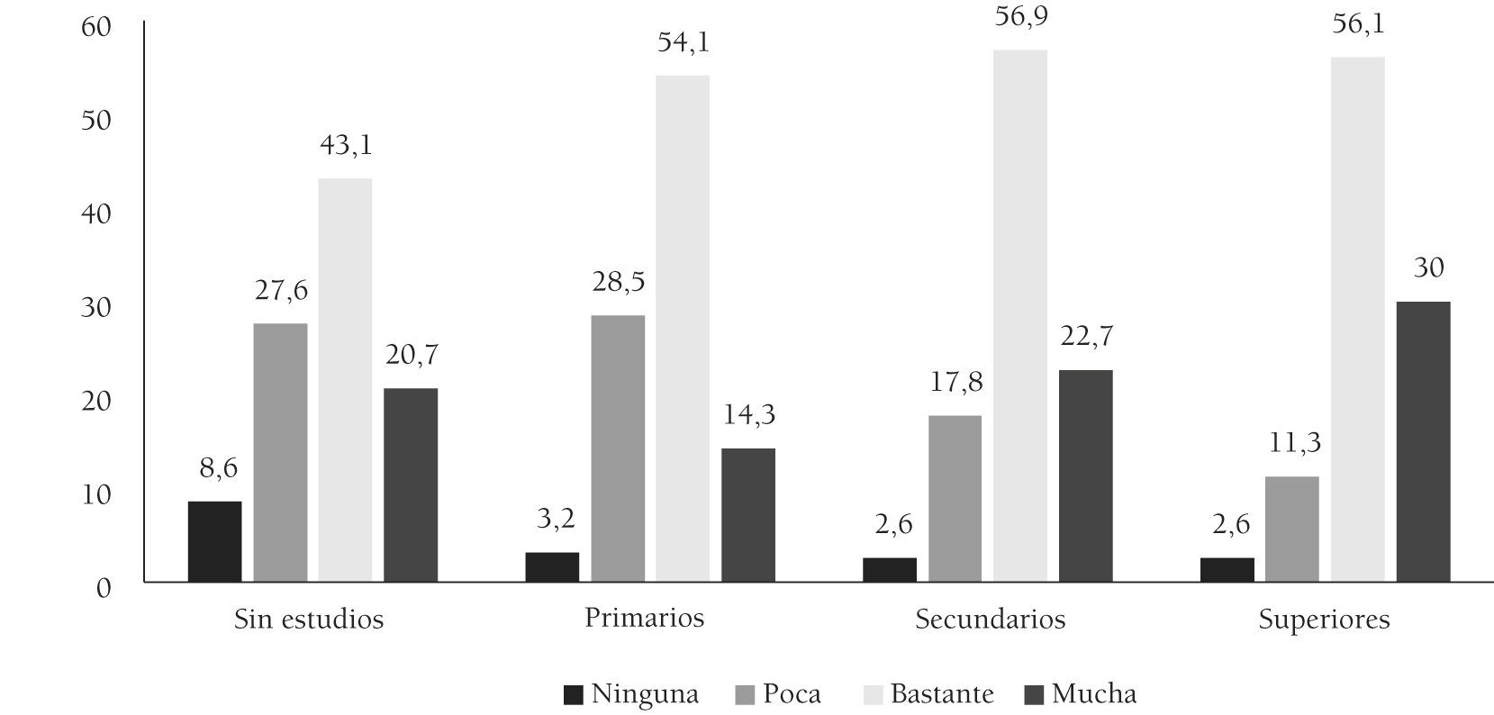 Una realidad similar muestran los datos en el caso paterno, ya que cuando ellos cuentan con estudios superiores la importancia del ocio es mucha o bastante en el 86,1% de los casos, mientras que cuando tienen estudios primarios se limita al 63,8% (ver figura 2).
