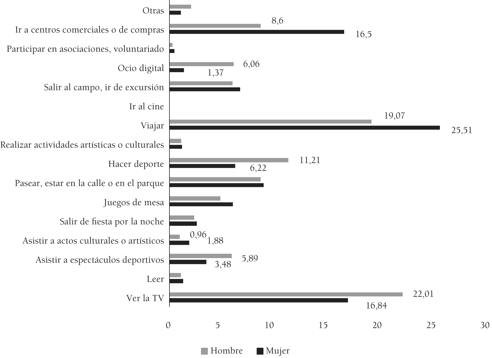 Con notables diferencias en la estructura y en el tiempo disponible, el ocio de los varones se inclina más hacia el deporte y el de las mujeres hacia el ámbito cultural —música, teatro y conciertos— (Benedicto, 2016Benedicto, J. (dir.) (2016). Informe Juventud en España. Madrid: Instituto de la Juventud. ), pasando, en general, los chicos más tiempo en juegos activos y al aire libre y las chicas en actividades de interior y más estáticas (Eaton y Enns, 1986; Harper y Sanders, 1975; Cherney y London, 2006Cherney, I. D. y London, K. (2006). Gender-linked differences in the toys, television shows, computer games, and outdoor activities of 5- to 13-year-old children. Sex Roles, 54(9-10), 717-726. doi: 10.1007/s11199-006-9037-8). Mientras ellas se reúnen en sitios más recogidos e íntimos para entablar conversaciones con su grupo de pares, los varones se decantan por lugares abiertos y amplios (Megías y Ballesteros, 2014Megías, I. y Ballesteros, J. (2014). Jóvenes y género. Estado de la cuestión. Madrid: FAD.). Cabe subrayar que estas diferencias de género son similares entre países, pues en las comparaciones realizadas en torno a las principales prácticas de ocio desarrolladas en la adolescencia (ver la televisión, deporte y otras actividades estructuradas), los territorios de la cultura occidental posindustrial —por ejemplo, Norteamérica y los países europeos— obtienen resultados semejantes (Athenstaedt, Mikula y Bredt, 2009Athenstaedt, U., Miluka, G. y Cornelia, B. (2009). Gender role self-concept and leisure activities of adolescents. Sex Roles, 60(5-6), 399-409. doi: 10.1007/s11199-008-9543-y).