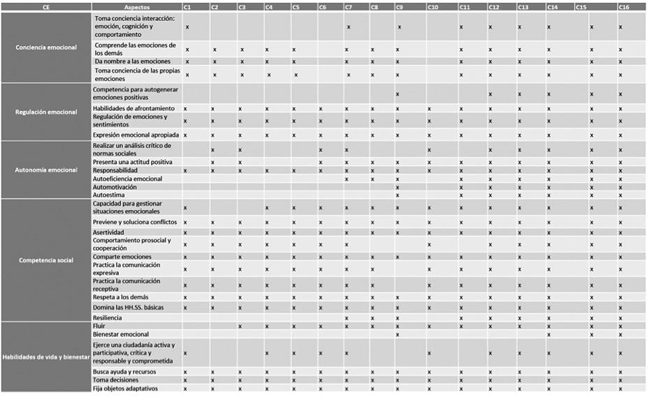 El currículo oficial determinado por la Orden ECI/3854/2007, común para todas las titulaciones de maestro del Estado, se conforma de 31 competencias en formación básica, 26 en materias didáctico disciplinares y 8 en prácticum. Tras un análisis de las mismas, se observa que en 16 se contemplan aspectos relativos a competencias emocionales (ver tabla 1), y en concreto en relación con: