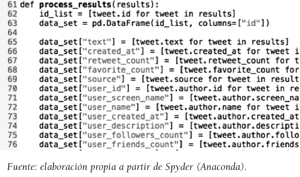 Con el fin de conocer la visión de los maestros a través de las redes sociales, metodológicamente se hacía necesario, primero, determinar cuál, eligiendo Twitter por su potencial y permeabilidad y, segundo, crear un script capaz de recolectar a través de la API Rest todos los tuits publicados con el hashtag #DíaMundialDelDocente (incluidos además los del #DiaMundialDelDocente, por las habituales faltas de ortografía en las redes sociales). Todo este proceso nos ayudó a la obtención de un total de 1.441 tuits del 5 de octubre de 2018, aunque en días anteriores y posteriores también hubo actividad, pero al no estar dentro de la efeméride quedaron fuera de este estudio.