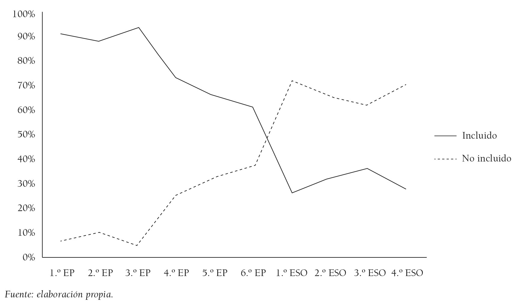 Atendiendo al primer objetivo de este trabajo, la figura 1 muestra un primer análisis de la presencia de alumnos con NEAE en los programas bilingües en función de la etapa educativa y de las necesidades que presentan. En ella se indica la tasa de inclusión y no inclusión de este alumnado en las etapas de EP y ESO en las SB de los centros educativos participantes. Se observa claramente cómo la tendencia a la inclusión existente en los dos primeros ciclos de EP (con índices cercanos al 90%) se reduce a partir de 4.o de EP, principalmente en el último ciclo de esta etapa. Es a partir del primer ciclo de ESO cuando las tasas de no inclusión superan claramente a las de inclusión.