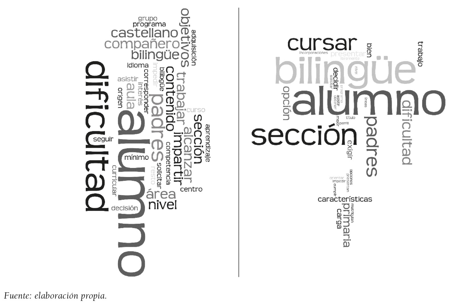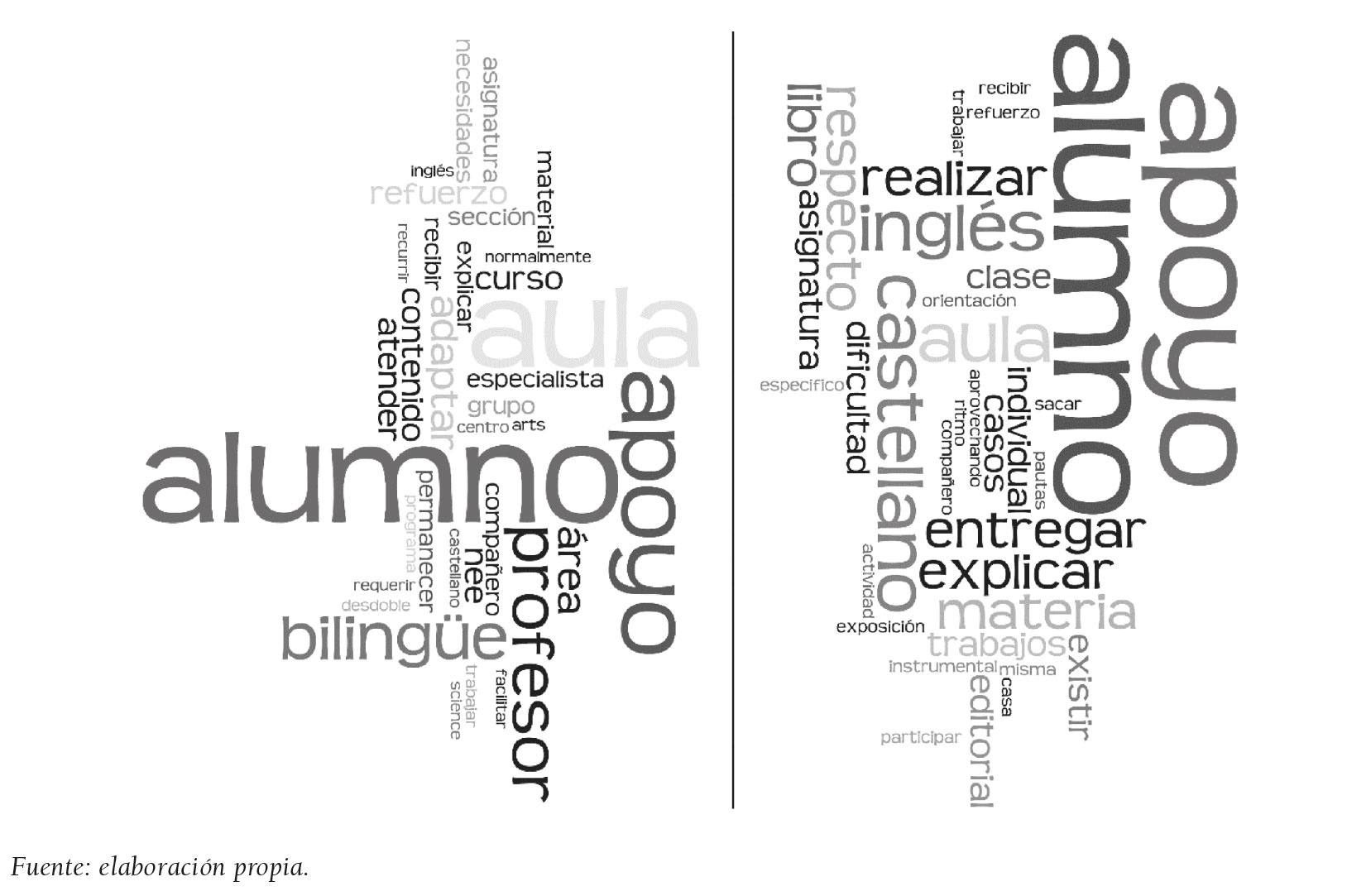 Las cuestiones cualitativas se estudiaron a partir de un análisis de contenido. De cara al estudio inicial sobre las frecuencias de palabras, a fin de evitar interpretaciones sesgadas, se llevó a cabo un filtrado de la información textual, homogeneizando los términos: los verbos fueron colocados previamente en forma infinitiva, los sustantivos en forma singular, etc. En paralelo, para facilitar un estudio de categorías incluidas en el discurso, se realizó un análisis inductivo del texto a partir del cual se extrajeron nueve grandes categorías en los discursos, cinco en el ámbito de los apoyos que se proveen al alumnado con NEAE para facilitar su inclusión en los programas bilingües y cuatro sobre los motivos que llevan a excluir a estos alumnos de las secciones bilingües. Las categorías resultantes fueron las siguientes: