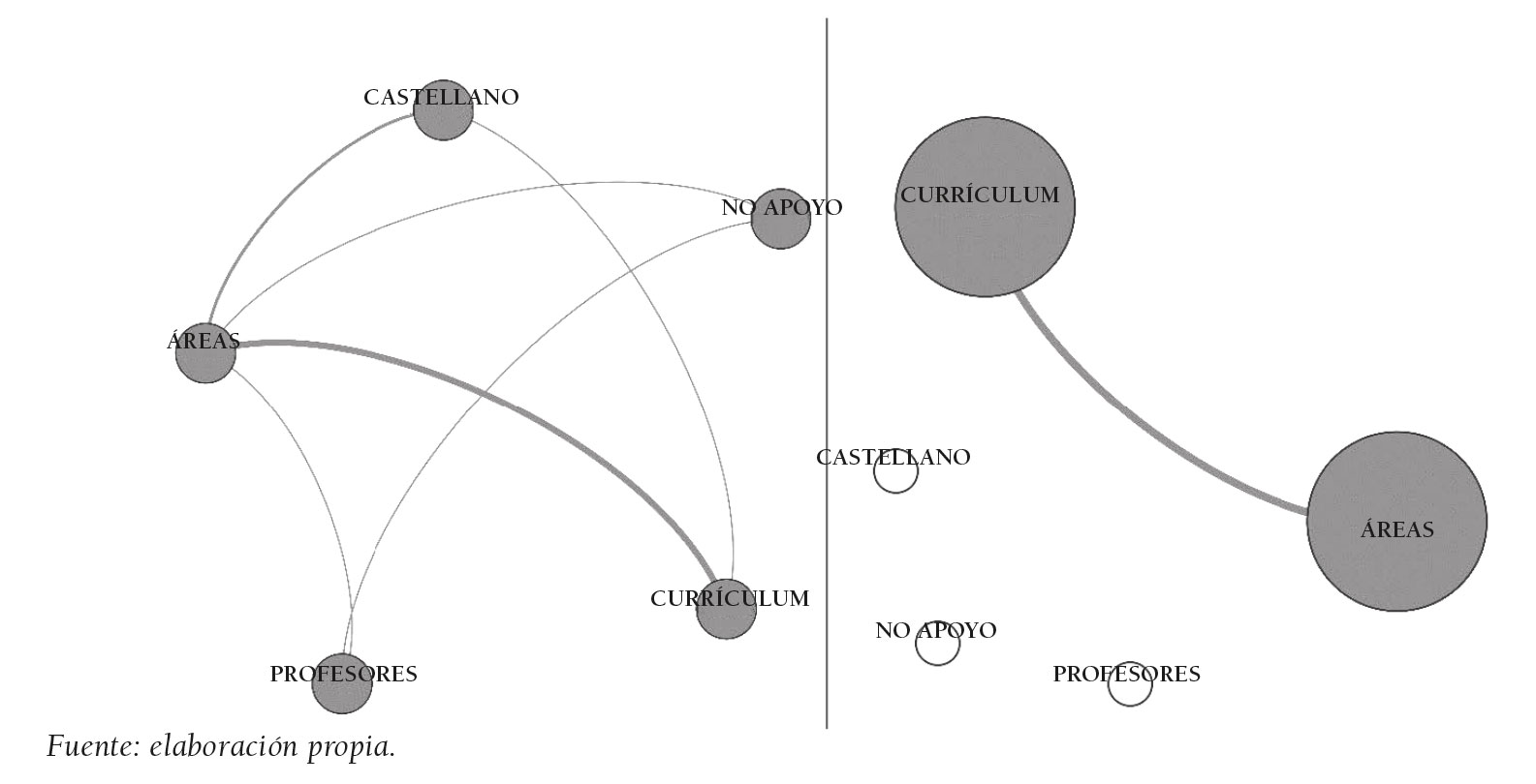 En cuanto a las relaciones establecidas entre estas categorías, se presentan los grafos para los grupos de EP y ESO por separado. En la figura 4 se muestran estas diferencias por etapa educativa sobre los apoyos prestados a los alumnos con NEAE en las SB. Mientras que en EP todas las categorías alcanzan una importancia similar en cuanto a las relaciones establecidas entre ellas, el grafo de ESO es mucho menos equilibrado. Las categorías relacionadas con las adaptaciones en las áreas del currículum y el apoyo en las áreas instrumentales son las únicas relacionadas de algún modo en ESO. En EP, la relación más intensa se establece entre estas dos categorías anteriores, pero también se producen otras menores.