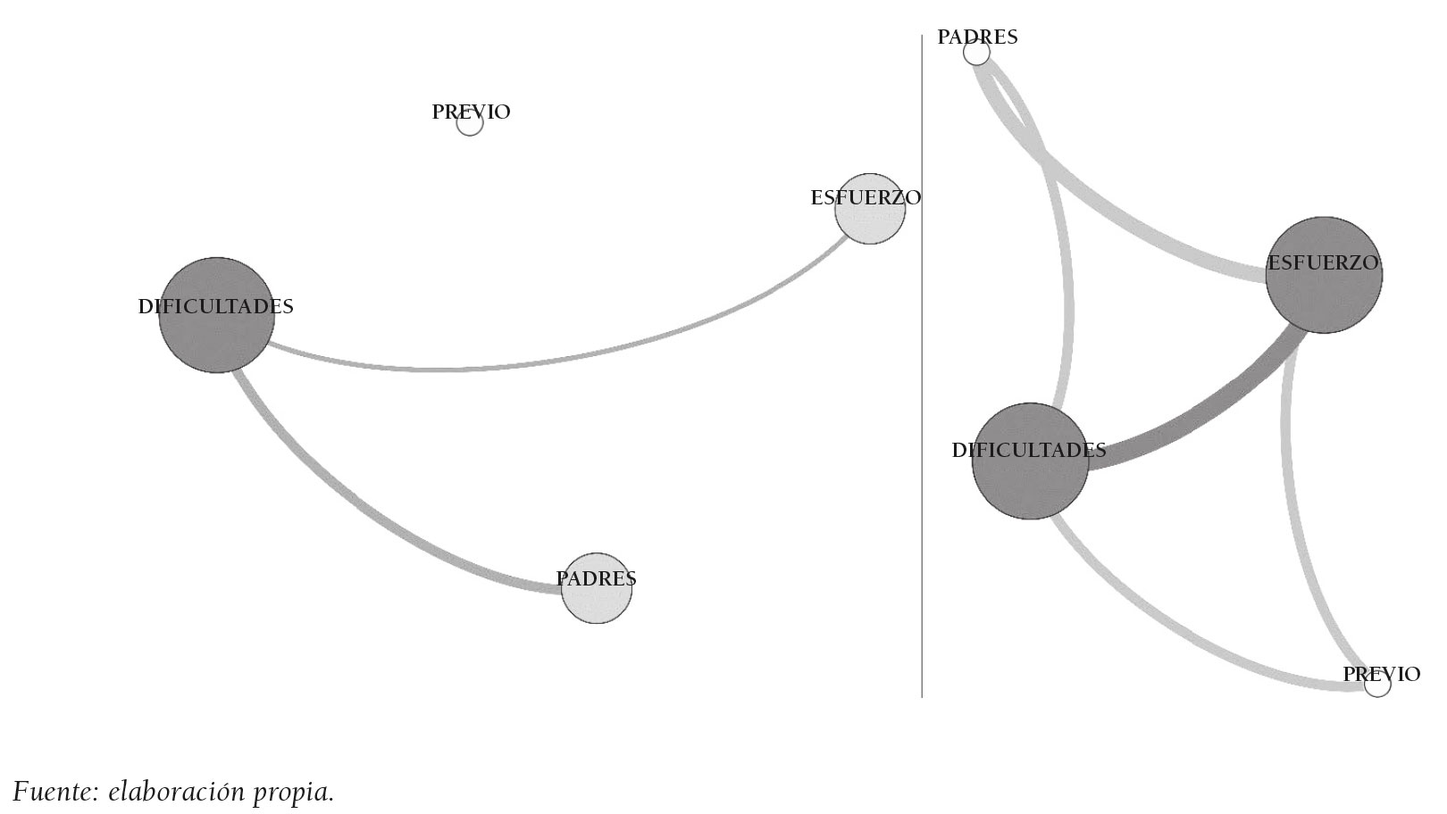 Al analizar los motivos que llevan a la exclusión, la figura 5 muestra los grafos de relaciones entre las categorías establecidas. En EP el nodo principal alude a las dificultades que presenta el alumnado, estando muy vinculado al argumento de que son los padres los que tomaron la decisión de la exclusión. También se vinculan estas dificultades con la percepción de que el alumno debe realizar un esfuerzo excesivo para sus capacidades si quiere seguir integrado en la SB.