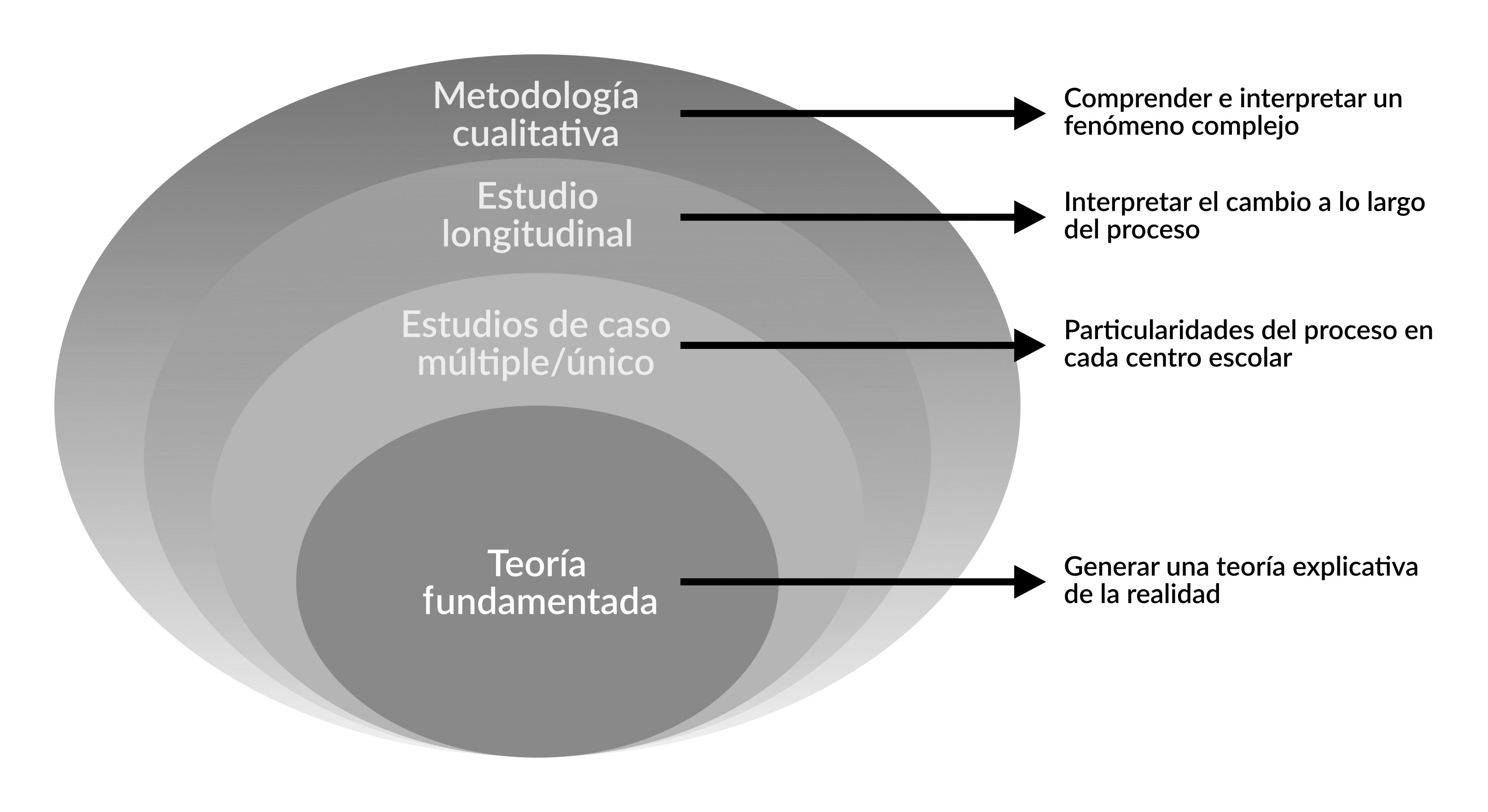 Se opta por una investigación cualitativa, multimétodo, plural y longitudinal, que implica una aproximación interpretativa y naturalista del fenómeno educativo (figura 1) (Denzin y Lincoln, 2005Denzin, N. K. y Lincoln, Y. S. (2005). The Sage handbook of qualitative research. Londres: SAGE Publications.; Flick, 2004Flick, U. (2004). Introducción a la metodología cualitativa. Madrid: Morata. ; Hernández et al., 2006Hernández, R., Fernández-Collado, C. y Baptista, P. (2006). Metodología de la investigación. México: McGraw Hill.). Se han estudiado cuatro centros educativos a lo largo de seis años, evaluando repetidamente el proceso de integración de las TIC en tres momentos diferentes, mediante estudios de caso múltiples (estudios 1 y 3) y estudio de caso único (estudio 2), para explorar todos los factores de manera pormenorizada (Cohen y Manion, 2002Cohen, L. y Manion, L. (2002). Métodos de investigación educativa. Madrid: Morata.; Yin, 2009Yin, R. K. (2009). Case study research: design and methods. Thousand Oaks, California: SAGE Publications.; Stake, 1998Stake, R. E. (1998). Investigación con estudio de casos. Madrid: Morata.).