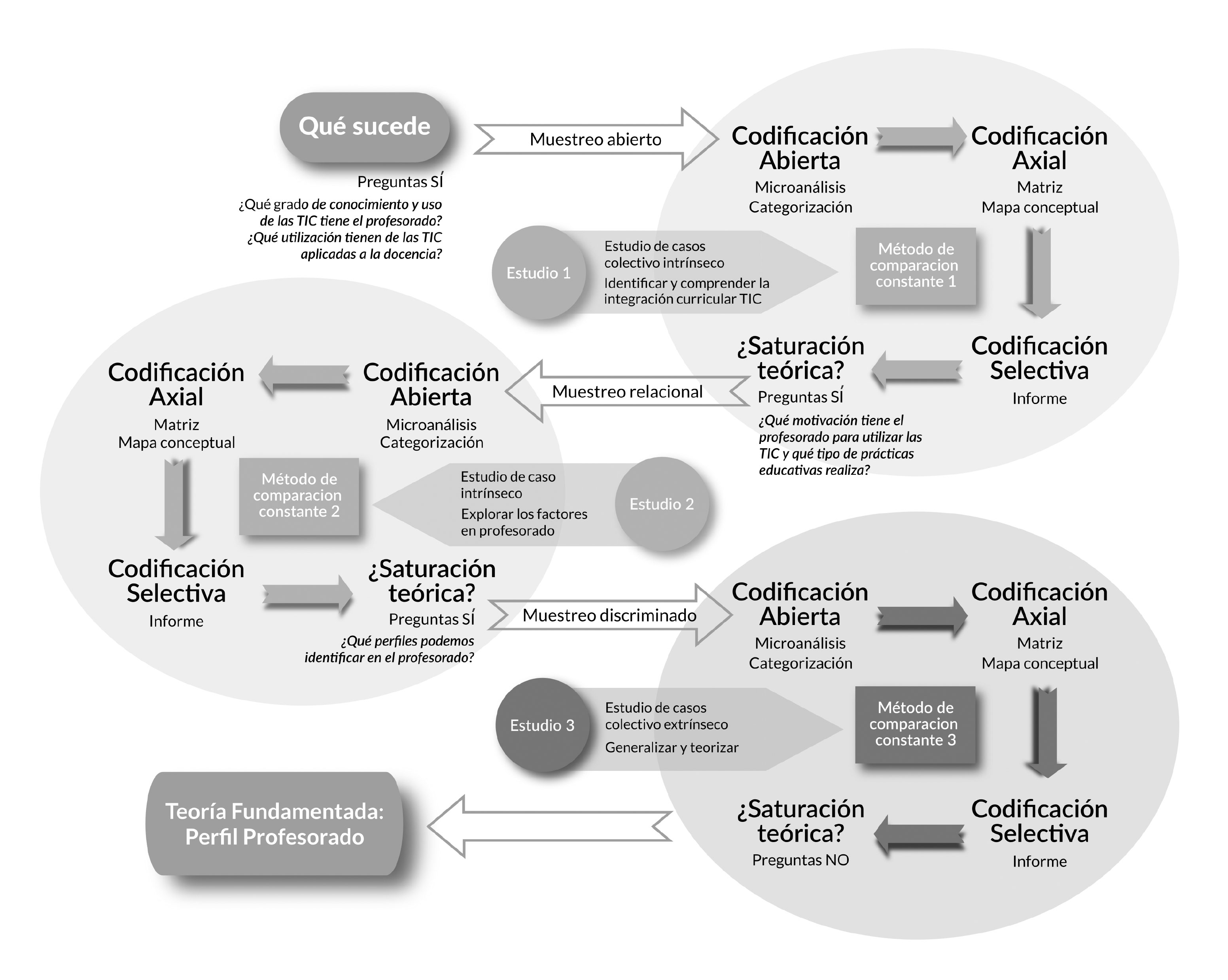 El diseño de investigación es iterativo, formulando sucesivamente preguntas de investigación que deben explorarse para lograr conformar la teoría (Trinidad, Carrero y Soriano, 2006Trinidad, A., Carrero, V. y Soriano, R. M. (2006). Teoría fundamentada “Grounded Theory”. La construcción de la teoría a través del análisis interpretacional. Madrid: Centro de Investigaciones Sociológicas.). Este proceso ha estado pautado por el “muestreo teórico” (Strauss y Corbin, 2002Strauss, A. y Corbin, J. (2002). Bases de la investigación cualitativa. Técnicas y procedimientos para desarrollar la teoría fundamentada. Colombia: Universidad de Antioquia.), diferente en cada momento, según el objetivo que ha ido emergiendo del análisis: 1) “muestreo abierto”, para recolectar toda la información posible; 2) “muestreo relacional”, para buscar incidentes, dimensiones y relaciones de los conceptos emergidos; 3) “muestreo discriminado”, para comprobar y saturar las categorías.