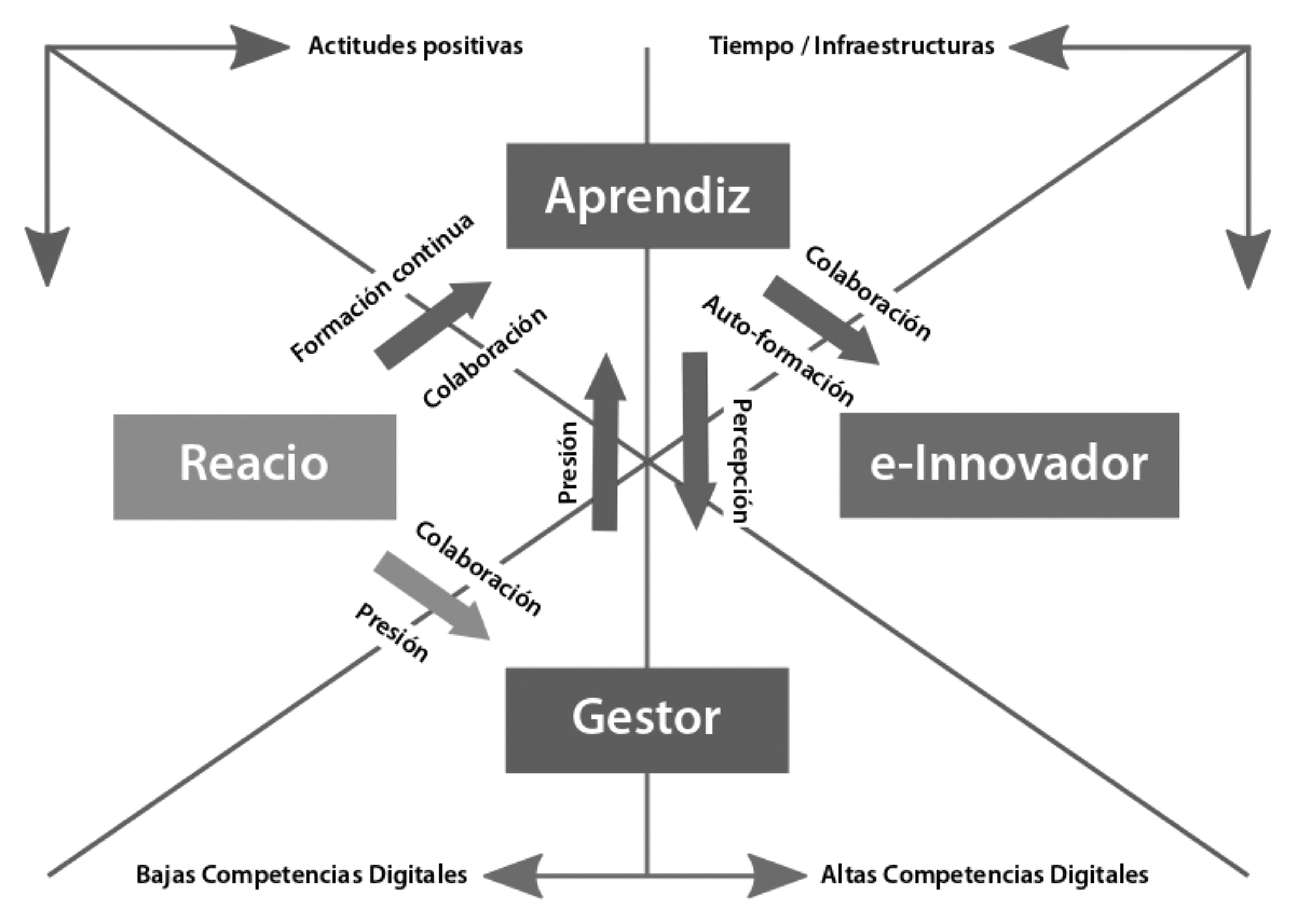 Por otro lado, las competencias digitales de los docentes también influyen en el uso de las TIC en el aula. El profesorado “reacio” tiene un nivel de competencia digital muy bajo (AsCPR1, PROCLAU, E2), el perfil de “e-innovador” se caracteriza por un elevado desarrollo competencial (Dir_cp01, TICPROFES, E3), y por último, los perfiles “aprendiz” y “gestor” se caracterizan por un nivel medio en su competencia digital (P11, MOTIC, E1). No obstante, estos perfiles no son cerrados, y un mismo docente puede evolucionar de uno a otro, o no progresar debido a diferentes factores como la formación, el tiempo (disponible y dedicado), las infraestructuras, la colaboración entre docentes o la presión que ejerce la administración educativa y las familias sobre los docentes para que incorporen las TIC en el aula.