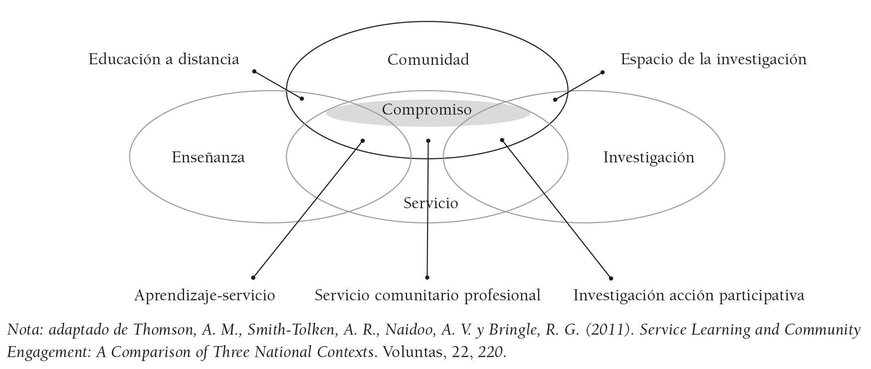 Las once contribuciones que se presentan en este monográfico son una clara expresión de la relevancia de esta pedagogía, que integra de forma explícita la misión de servicio de la universidad con la misión docente. Los resultados reflejan un compromiso con la participación ciudadana (Langseth y Plater, 2004Langseth, M. y Plater, W. M. (eds.). (2004). Public work and the academy: An academic administrator’s guide to civic engagement and service-learning. Bolton, Inglaterra: Anker.) y se propone una acción alternativa a la desarrollada por la universidad tradicional, que se caracteriza por enfoques jerárquicos y elitistas (Kellogg Commission, 1999; McIlrath, 2012McIlrath, L. (2012). Community perspective on university partnership-prodding the sacred cow. En L. McIlrath, A. Lyons y R. Munck (eds.), Higher education and civic engagement: International perspectives (pp. 139-157). Nueva York: Palgrave Macmillan.). El ApS se aparta de la tradicional división tripartita de enseñanza-investigación-servicio, al asumir que el compromiso cívico no es simplemente un sustituto para el servicio profesional, sino una manera particular de hacer docencia, investigación y servicio en y con la comunidad (ver figura 1).