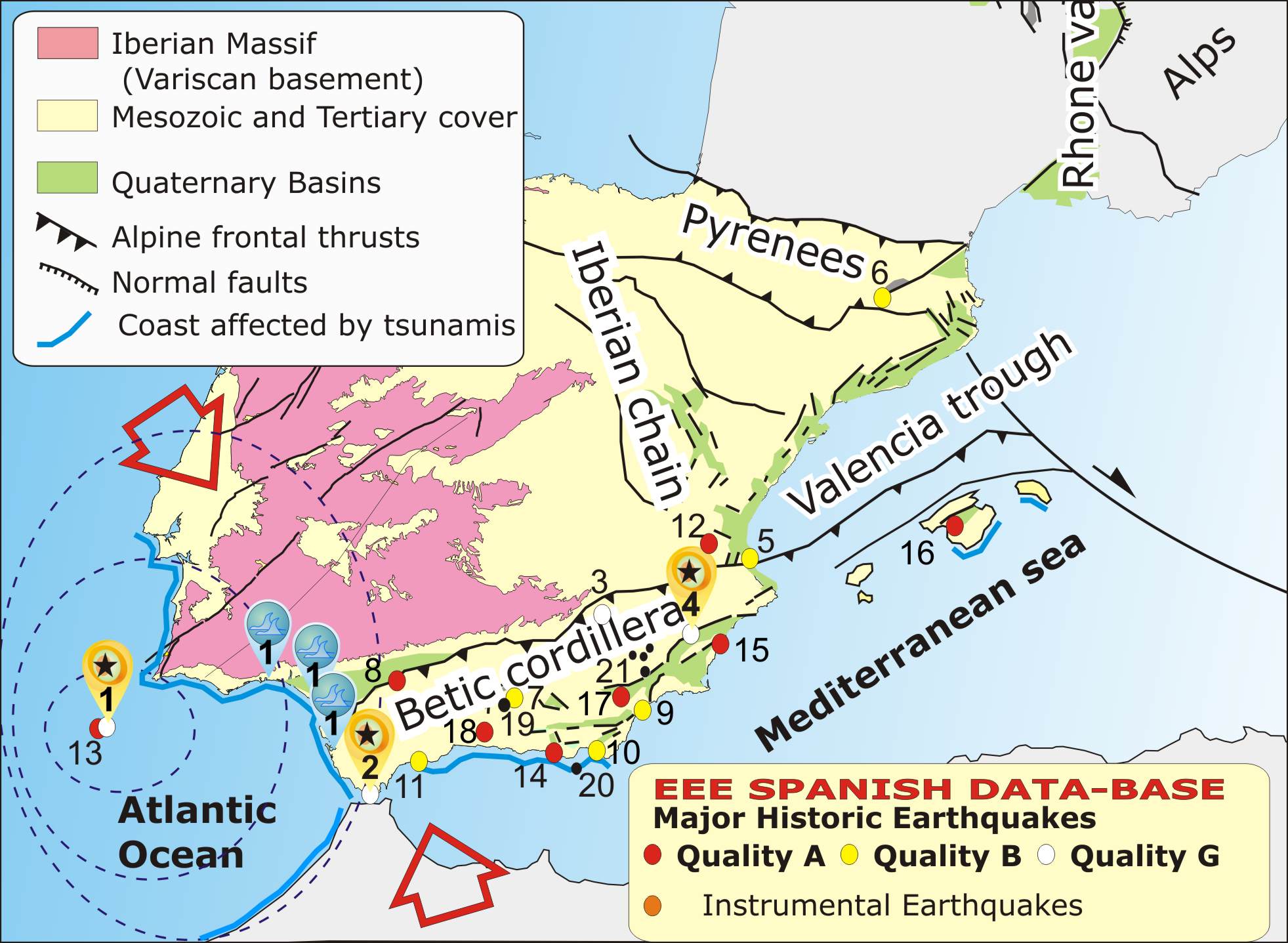 El presente trabajo recoge tres ejemplos de terremotos antiguos (218 AC, 40-60 AD y 1048 AD) ocurridos en zonas litorales del S y SO de la Península Ibérica con la intención de ilustrar el uso de datos geológicos y arqueológicos en la caracterización macrosísmica de los mismos. En la mayor parte de los sísmos ocurridos con anterioridad al siglo X d.C. la información documental histórica que se posee es muy escasa o inexistente. El presente trabajo muestra que el actual estado de conocimiento en paleosismología y arqueosismologia sobre este tipo de terremotos sobrepasa con creces la información documental histórica permitiendo la multiplicación de los puntos de información macrosísmica mediante el uso de la escala ESI-07 (Environmental Seismic Intensity). Consecuentemente, el análisis geológico de los terremotos antiguos mejora su conocimiento y análisis paramétrico, permitiendo avanzar la evaluación de la peligrosidad sísmica de las zonas afectadas. El aspecto que se pone de especial relieve en este trabajo es el análisis de la paleogeografía existente en la antigüedad, ya que todas las zonas (afectadas) analizadas en este trabajo corresponden a zonas estuarinas abiertas que se han ido rellenado por aportes fluviales o de forma artificial con el tiempo. Se analizan los efectos del terremoto de 218 AC en las zonas estuarinas del Golfo de Cádiz y muy especialmente en el antiguo Lacus Ligustinus (marismas del Guadalquivir) durante época romana; los efectos del terremoto de 40-60 AD en la antigua Bahía de Baelo Claudia (Estrecho de Gibraltar); y los efectos del terremoto de 1048 AD en el antiguo Sinus ilicitanus (Depresión del Bajo Segura) durante época musulmana. Se han cotejado descripciones de geógrafos romanos y árabes con modelos basados en datos geológicos. Este tipo de análisis ha permitido generar antiguos escenarios macrosísmicos basados en la paleogeografía y reinterpretar las distribuciones teóricas de intensidades y los efectos ambientales de los terremotos estudiados que es a lo que se refiere el concepto de “paleogeografía sísmica” propuesto en este trabajo.Descargas