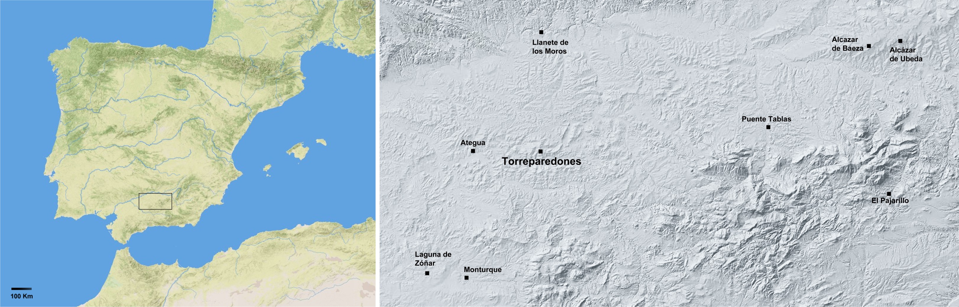 - Figura 1: Mapa de situación del yacimiento de Torreparedones (Baena, Córdoba) y otros registros polínicos mencionados en el texto.