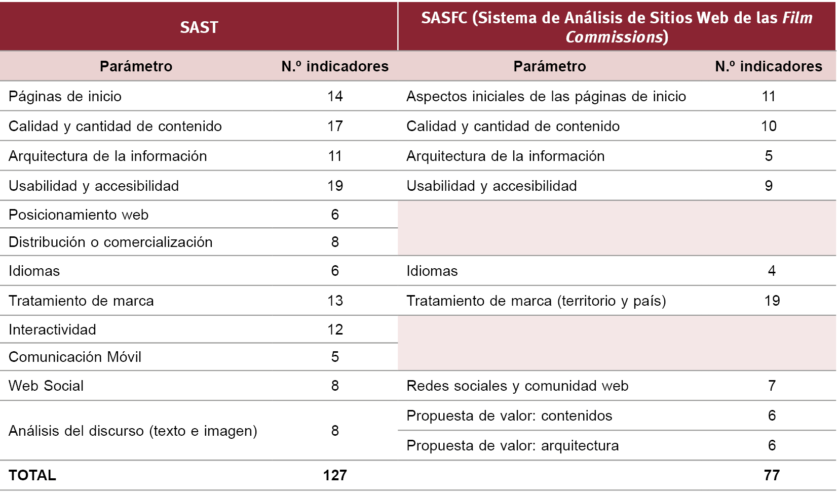 Fig. 1 / Parámetros originales del SAST (Sistema de Análisis de Sitios Web Turísticos) y su adaptación al SASFC (Sistema de Análisis de Sitios Web de las Film Commissions)