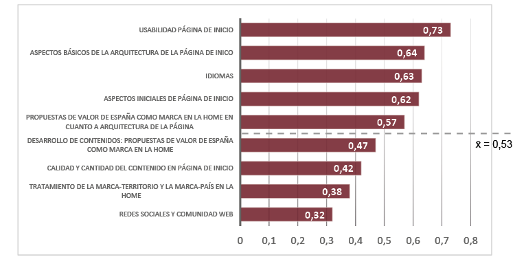 Los parámetros técnicos se mantienen, pero se adaptan para ser analizados con las páginas de inicio, lo que minimiza el número de indicadores a medir y elimina aspectos propios de las páginas web de sitios turísticos o que se analizan externamente (posicionamiento web, distribución o comercialización, interactividad, y comunicación móvil). El parámetro estratégico de análisis del discurso cobra mayor peso en el presente estudio, por lo que se cambia considerablemente para incorporar las categorías identificadas por los expertos entrevistados relativas a la propuesta de valor de España.