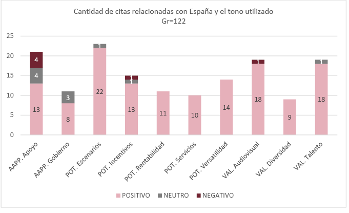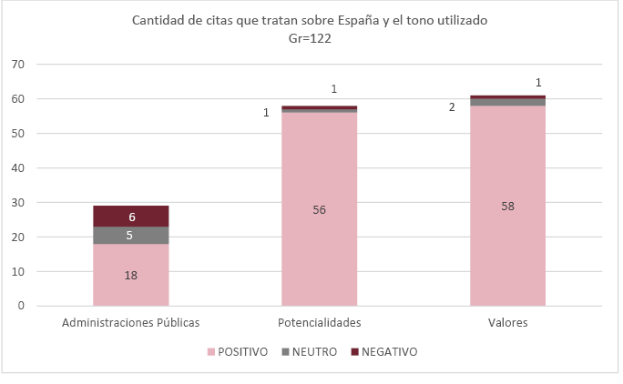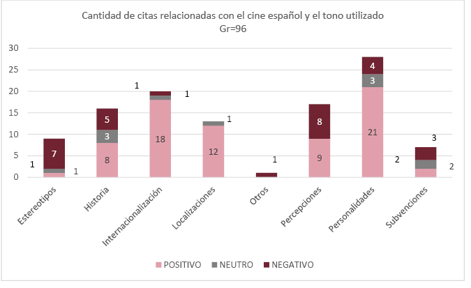 Se identifica una presencia generalizada del tono positivo en los tres bloques temáticos estudiados, especialmente en las respuestas relacionadas con España, donde las citas de carácter neutro y negativo no superan los 8 casos, respectivamente. En cuanto al tono negativo, destacan las 30 citas en el grupo del Cine, siendo el que más tiene en su haber.