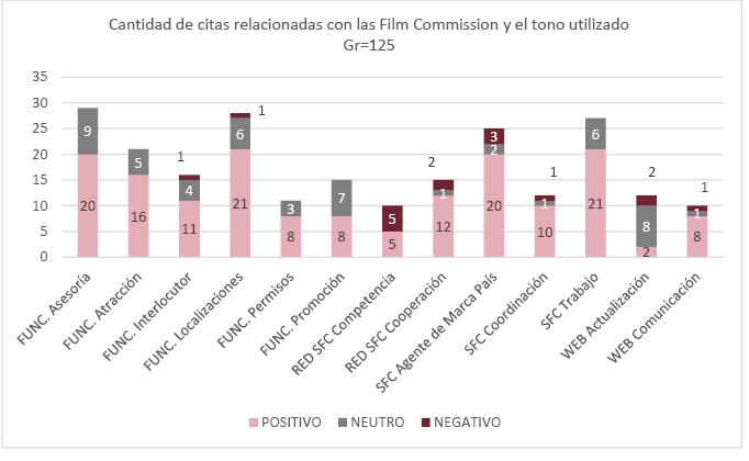 Atendiendo a los códigos establecidos, se han identificado tres grandes bloques: 1) citas relacionadas con el cine nacional, donde se codifican aquellas respuestas sobre el tema, además de sus personalidades, estereotipos, el papel que tiene como transmisor de valores y agente de marca país; 2) citas relacionadas con España, referidas a cuestiones como sus valores, potencialidades o su relación con las administraciones públicas; y 3) códigos vinculados a las film commissions, incluyendo funcionalidades y declaraciones en torno a la SFC, su red de oficinas regionales y otras cuestiones sobre su web o sus posibles mejoras. Aparte de estos bloques, se establecen códigos para analizar simultáneamente el tono utilizado para presentar la información -positivo, negativo o neutro-.