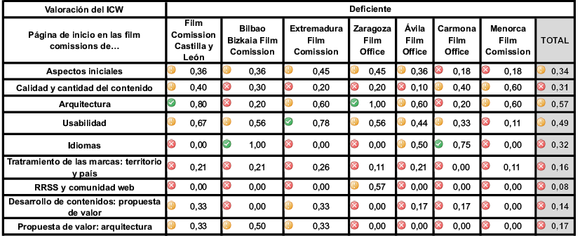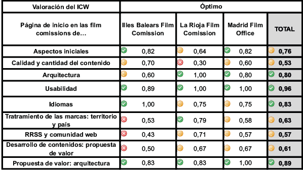 Finalmente, para la obtención del Índice de Calidad Web (ICW): 1) cada indicador se puntúa con 0 (deficiente) o 1 (óptimo); 2) se obtiene la media aritmética de la puntuación obtenida en cada parámetro; y 3) se arroja el promedio global para el conjunto de parámetros de la muestra.