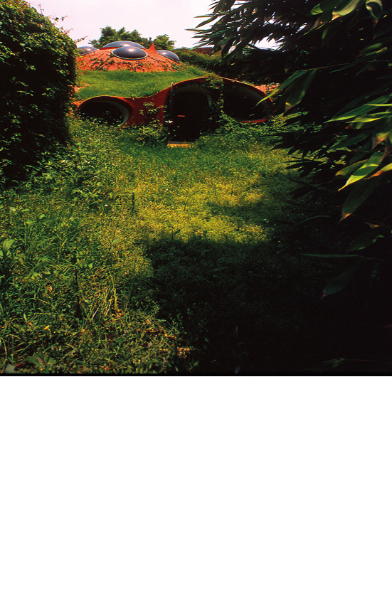 (...) La duna verde es la envolvente del volumen interior que es casi invisible. Desde el exterior sólo vemos pasto, arbustos, árboles y flores. Caminar sobre el jardín es caminar sobre el techo mismo de la casa sin darse cuenta”. (Senosiain, 2008, p. 59)