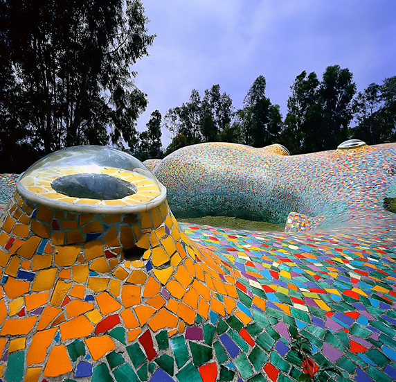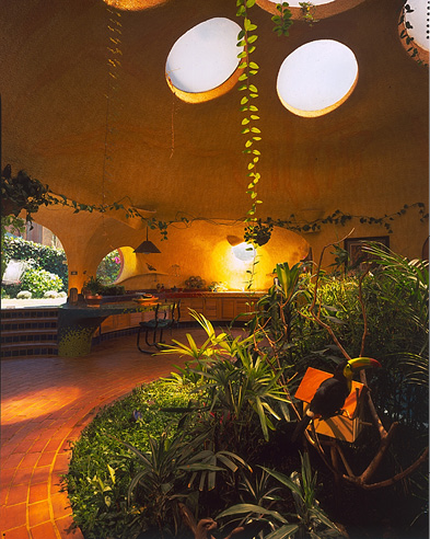 En algunos de sus proyectos se aplican sistemas de cascaras livianas que recuerdan grandes huevos, realizados con la técnica del “ferrocemento”, que se apoyan delicadamente en el suelo, formando concavidades típicas de las pozas de agua, cubiertas luego con una capa de tierra, arbustos, y buganvillas trepadoras.