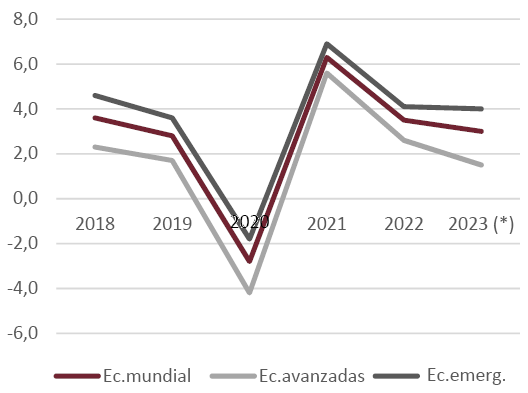 Fig. 1 / Economía mundial, países desarrollados y países emergentes. Tasas de variación anual del Producto Interior Bruto (PIB), precios constantes, 2018-2023 (previsión)